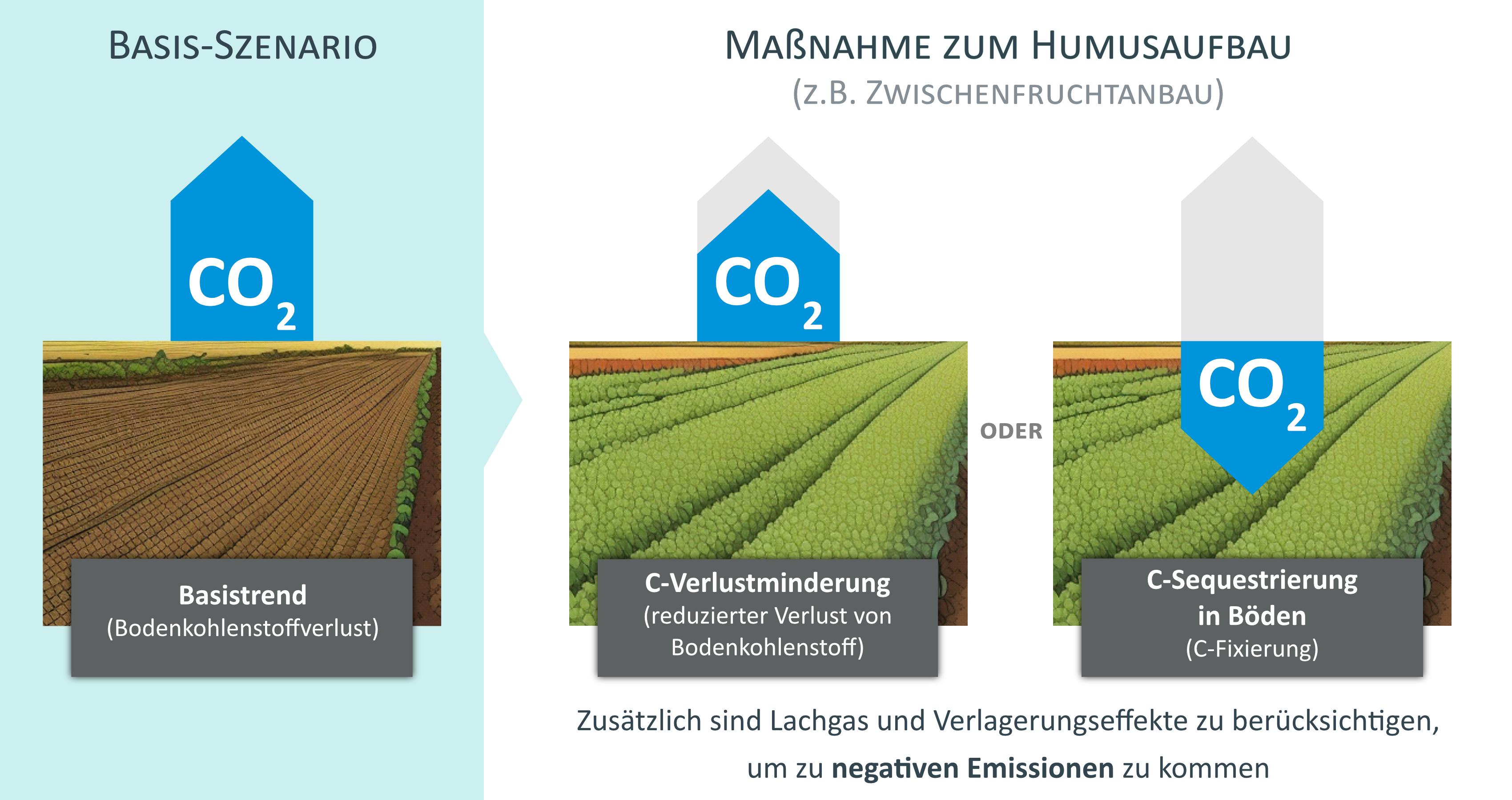 Wenn man also beurteilen will, welche Klimawirkung eine bestimmte Maßnahme zum Humusaufbau hat, muss man alle Treibhausgasemissionen berücksichtigen. Sonst besteht die Gefahr, völlig falsche Schlussfolgerungen zu ziehen. Wenn alle Treibhausgaseffekte einer Maßnahme zusammenrechnet werden und dann immer noch mehr Treibhausgase gebunden als emittiert werden, so spricht man von „negativen Emissionen“.