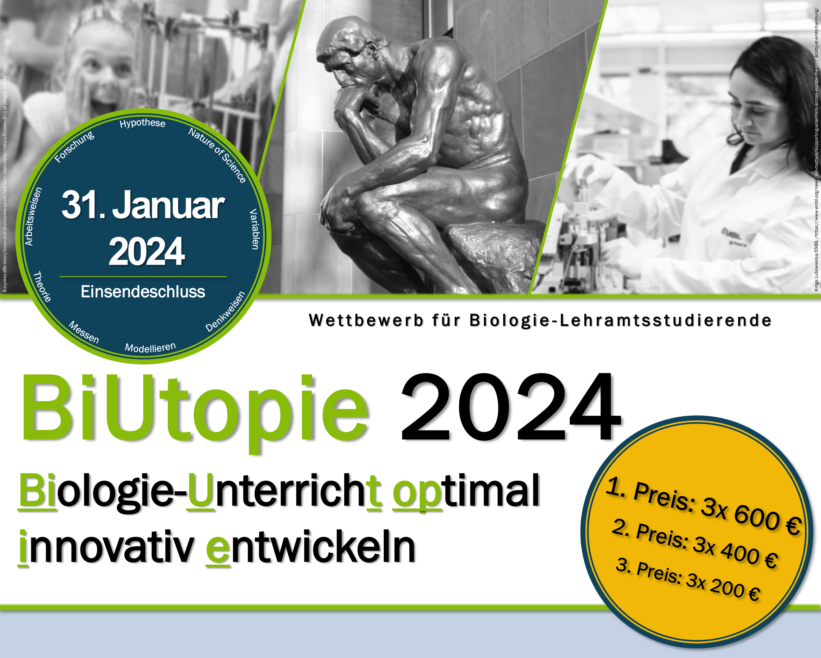 Die Abteilung Didaktik der Biologie an der Freien Universität Berlin schreibt gemeinsam mit der Sektion Fachdidaktik der Biologie im VBIO (FDdB) den Wettbewerb „BiUtopie: Biologie-Unterricht optimal innovativ entwickeln“ aus. Der von der Klaus-Tschira-Stiftung geförderte Wettbewerb soll zur Stärkung evidenzbasierter Unterrichtsplanung beitragen und den Transfer von theoretisch und empirisch fundierter Lehr-Lernforschung in die Praxis fördern. Teams aus drei Biologie-Lehramtsstudierenden und deren Betreuer/-innen können sich bis zum 31. Januar 2024 bewerben.
