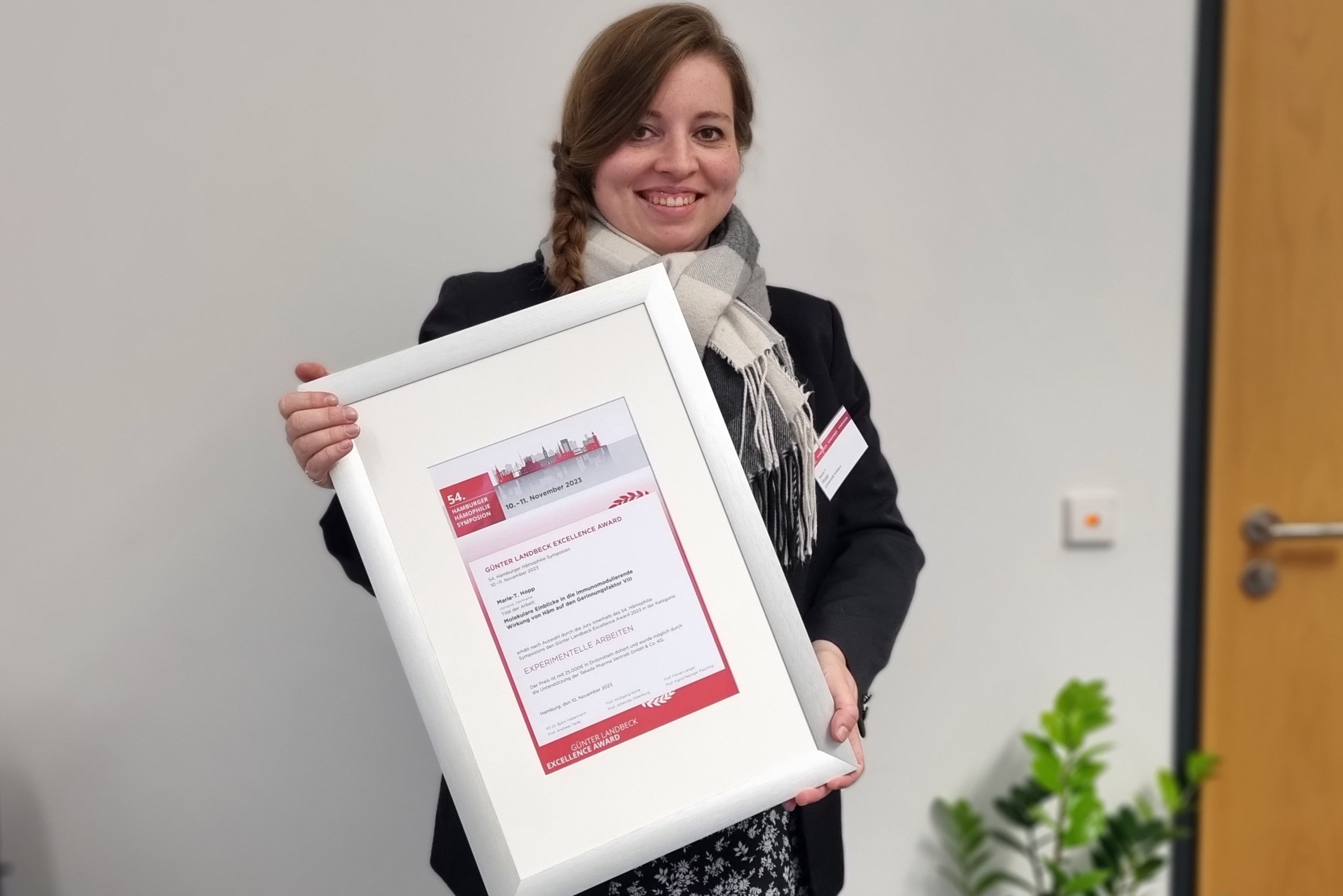 Jun.-Prof. Dr. Marie-T. Hopp, Juniorprofessorin für Organische Chemie – Bioorganische Chemie am Institut für Integrierte Naturwissenschaften der Universität Koblenz, erhielt den renommierten Günter Landbeck Excellence Award in der Kategorie „Experimentelle Arbeiten“. Diese Auszeichnung ist am 10. November 2023 ihr im Rahmen des Hamburger Hämophilie Symposions für herausragende Forschung im Bereich der Hämostaseologie verliehen worden.