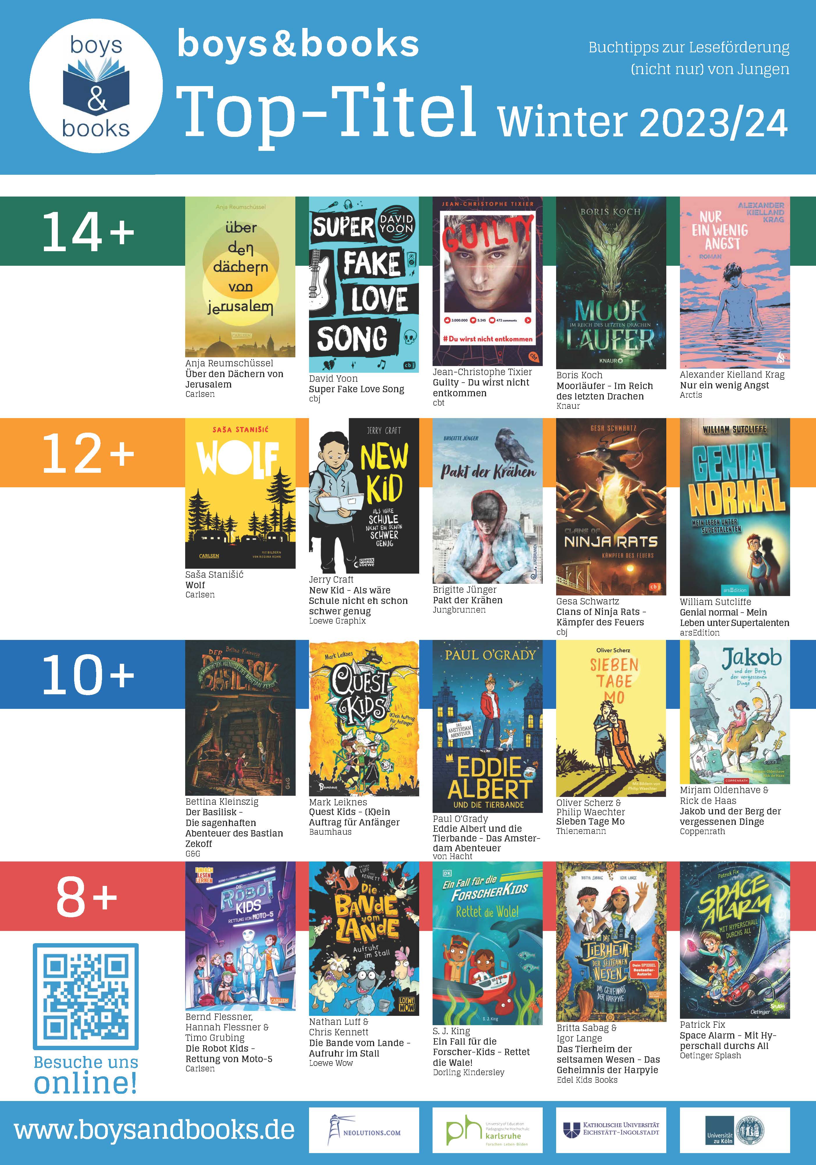 Rund 180 Neuerscheinungen des deutschsprachigen Büchermarkts 2023 hat die Fachjury des bundesweiten Leseförderprojekts boys & books unter die Lupe genommen und zwanzig Titel ausgewählt, die sich besonders als Lektüre für Jungen zwischen 8 und 18 eignen. Zu finden sind die Top-Titel für den Lesewinter 2023/24 seit dieser Woche auf www.boysandbooks.de.