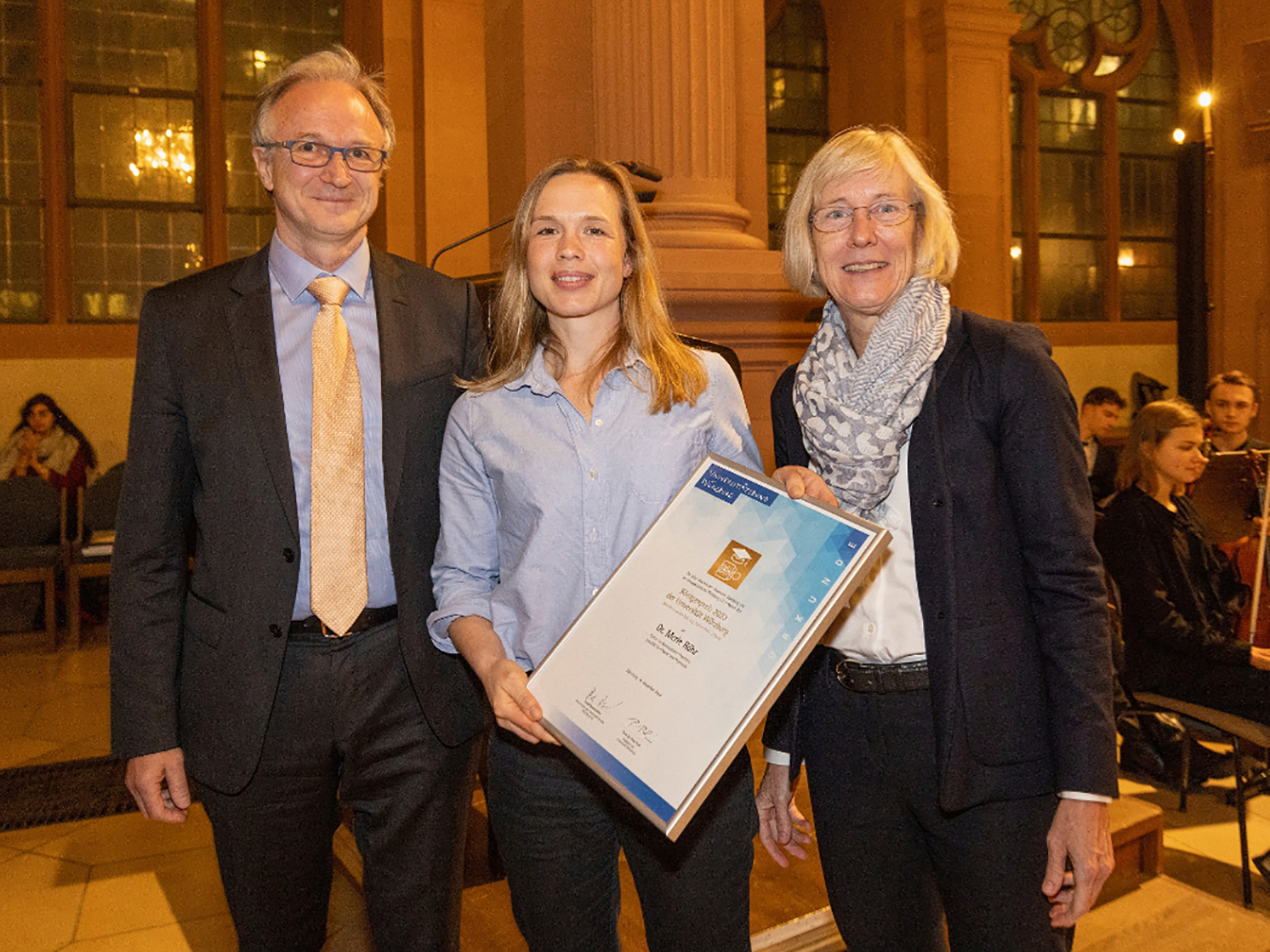 „Darum war im Jahr 2018 die Entscheidung der Fakultät schnell getroffen, welche Nachwuchswissenschaftlerin aus dem Emil-Hilb-Programm der JMU gefördert werden sollte, um sich ein eigenständiges Forschungsprofil zu erarbeiten“, so Frank Würthner in der Laudatio. Und das sei Merle Röhr auch schnell gelungen.