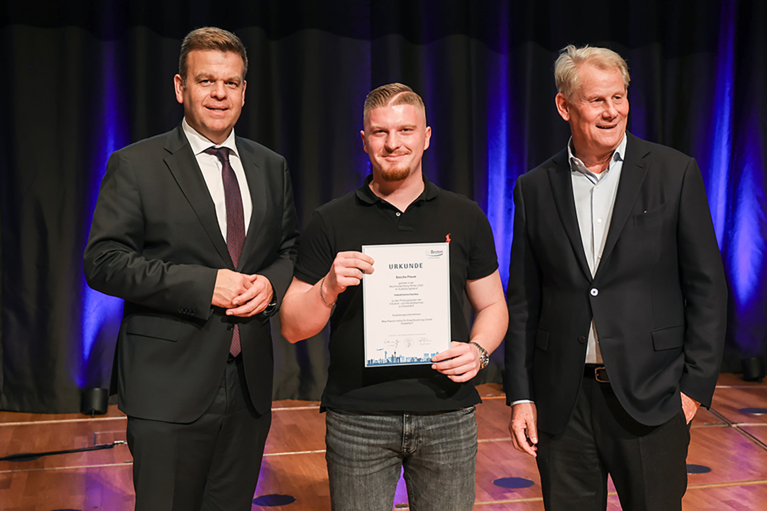 Sascha Flaum has successfully completed his three-and-a-half-year apprenticeship as an industrial mechanic at the Max-Planck-Institut für Eisenforschung (MPIE) with great success. The Düsseldorf Chamber of Industry and Commerce (IHK) recognized him and fellow trainees for their exceptional achievements at a ceremony held in the Tonhalle Düsseldorf. The event was attended by approximately 800 invited guests, including Matthias Geidmeier, State Secretary for Employment in North Rhine-Westphalia.