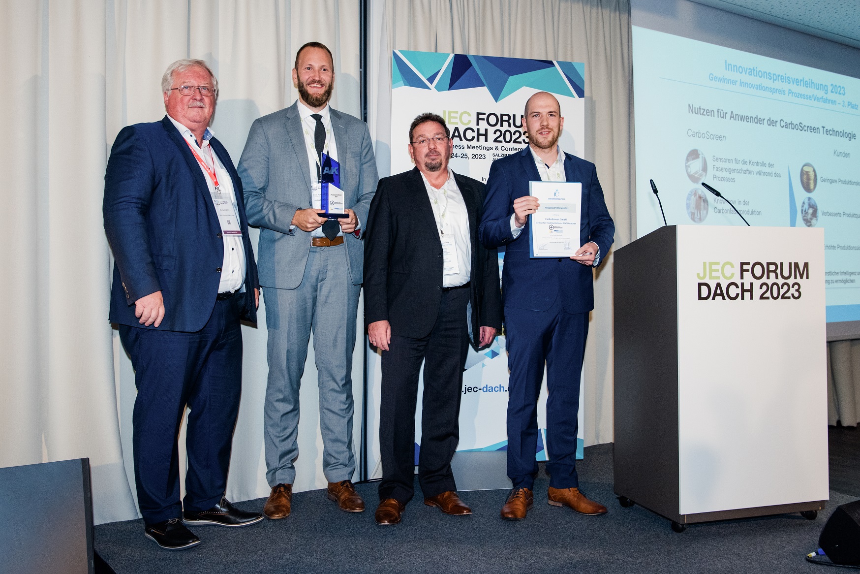 Felix Pohlkemper and Tim Röding from Institut für Textiltechnik (ITA) of RWTH Aachen University are developing a technology with their start-up Car-boScreen GmbH that makes complex carbon fibre production controllable through sensor monitoring. With the help of CarboScreen technology, it should be possible to double the production speed from the current 15 m/min to 30 m/min in the medium term. The doubling of production speed alone could result in an increase in turnover of up to €37.5 million per year and production plant. Felix Pohlkemper and Tim Röding were awarded third place in the AVK Innovation Award 2023 in the Processes and Procedures category for this ground-breaking development.