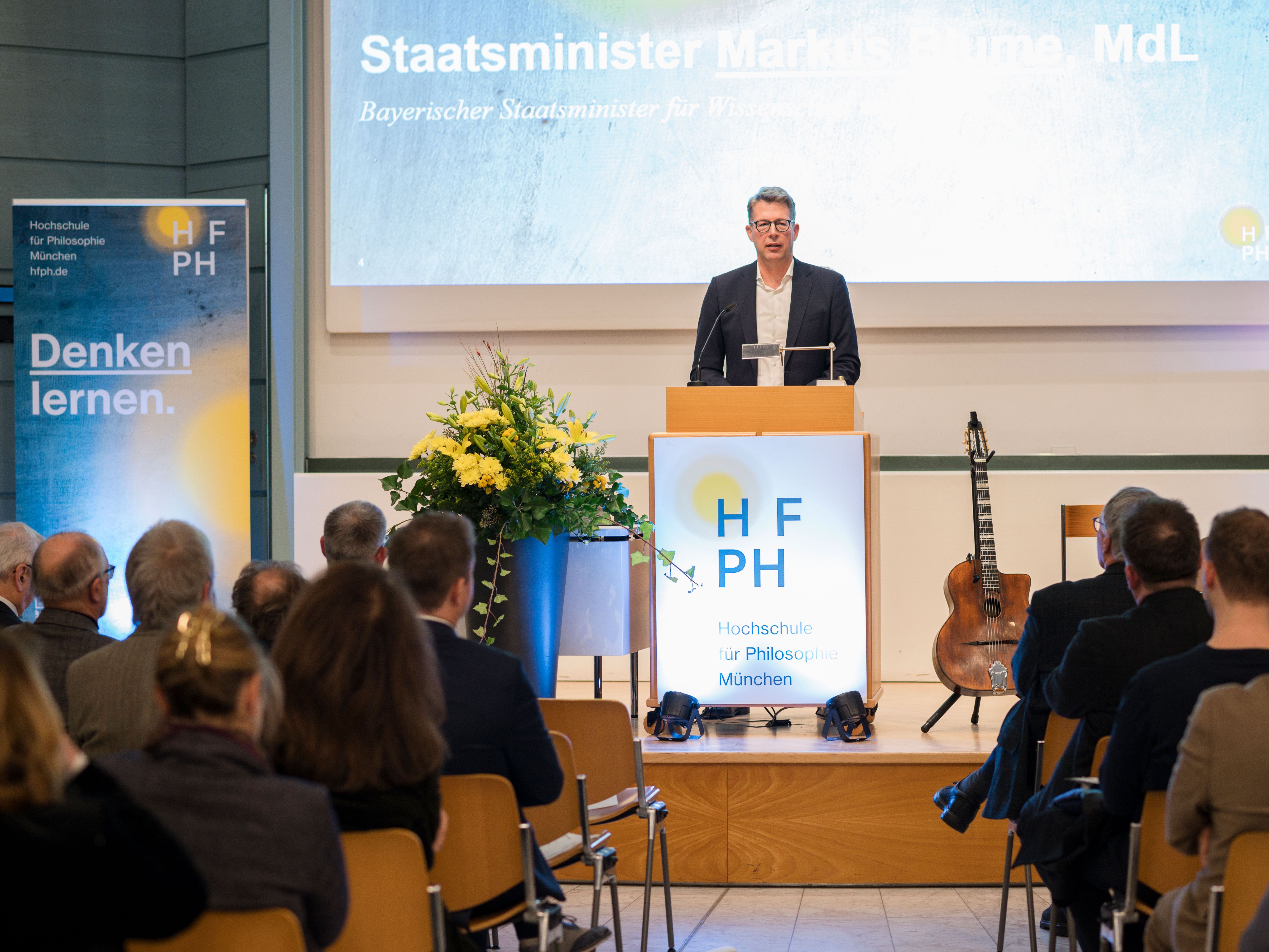 In einer Zeit, in der die Welt mit zahlreichen Herausforderungen wie Kriegen, dem zunehmenden Auseinanderbrechen unserer Gesellschaften oder der Klimakrise konfrontiert ist, war die diesjährige Akademische Feier der HFPH ein Anlass, um den Fokus darauf zu legen, welchen Beitrag die Philosophie und die Ethik zu einem Problemlösungsansatz leisten können. Bereits im Vorjahr unterstrich der Bayerische Staatsminister für Wissenschaft und Kunst Markus Blume MdL die Bedeutung der Philosophie als grundlegende Orientierungswissenschaft im akademischen Bereich und der gesamten Gesellschaft und bezeichnete die HFPH in diesem Zuge als „Diamant der bayerischen Hochschullandschaft“.
