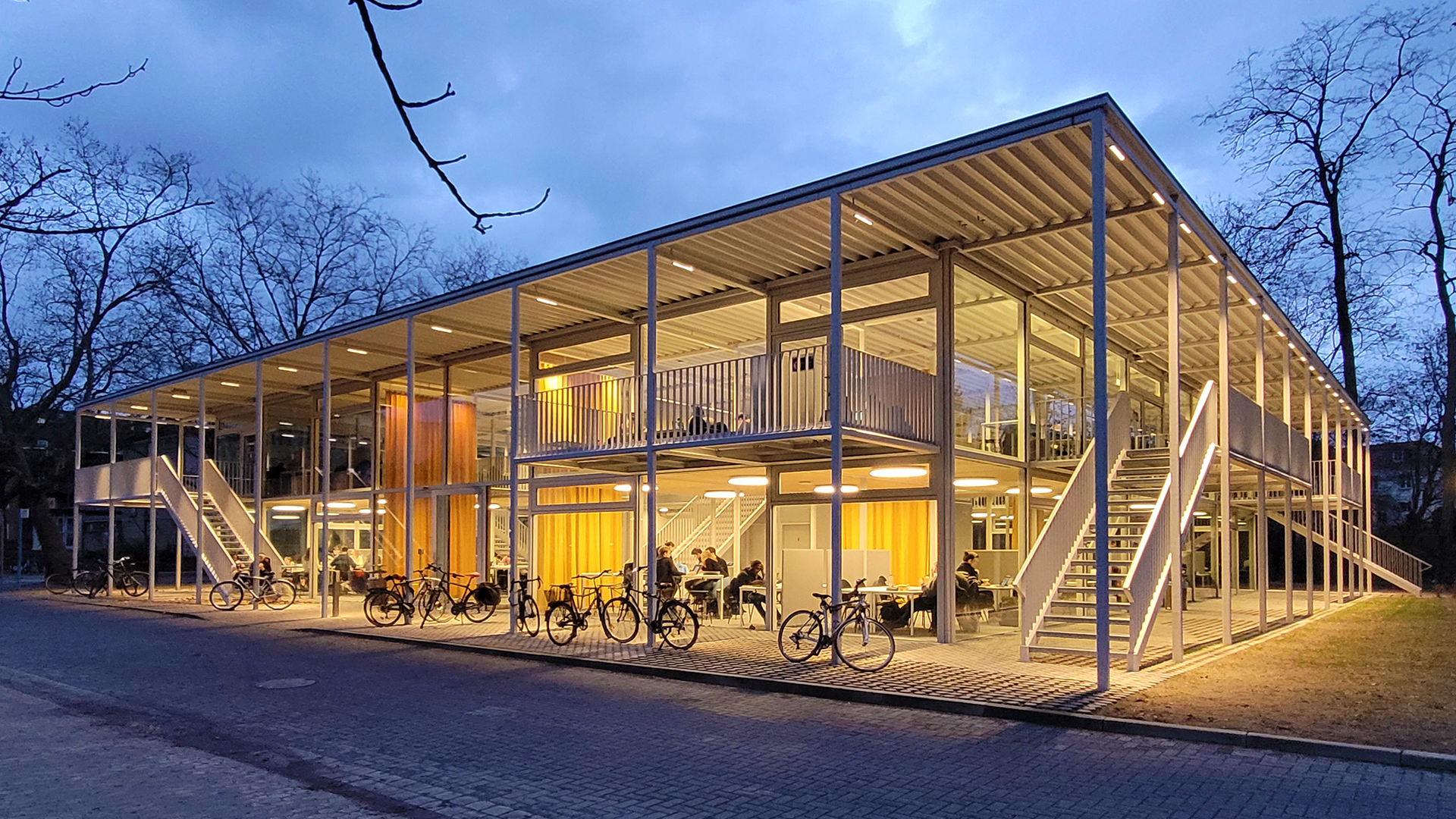 Der zweigeschossige filigrane Bau ähnelt einem Pavillon. Das Studierendenhaus zeichnet sich durch eine vollverglaste Fassade aus, die eine hervorragende Tageslichtqualität für alle Bereiche bietet und den Innen- und Außenraum nahtlos verbindet. Die Stahl-Holz-Hybridkonstruktion ermöglicht eine einfache Montage und De-Montage und folgt dem Prinzip des „Design for Disassembly“. Das auf einem quadratischen 3 x 3 Meter-Achsmaß konzipierte Primärtragwerk, bestehend aus Trägern und Stützen, ist modular und setzt sich aus immer gleichen 10 x 10 cm Quadrathohlprofilen zusammen. Die in die Trägerrahmen eingelegten Holzrippendecken sind nur punktuell verschraubt, die Fassade ist nicht verklebt und ebenso demontierbar. So können die Gebäudematerialien nicht nur wiederverwendet werden, sondern ganze Bauteile im Sinne des „zirkulären Bauens“ neue Verwendung finden.