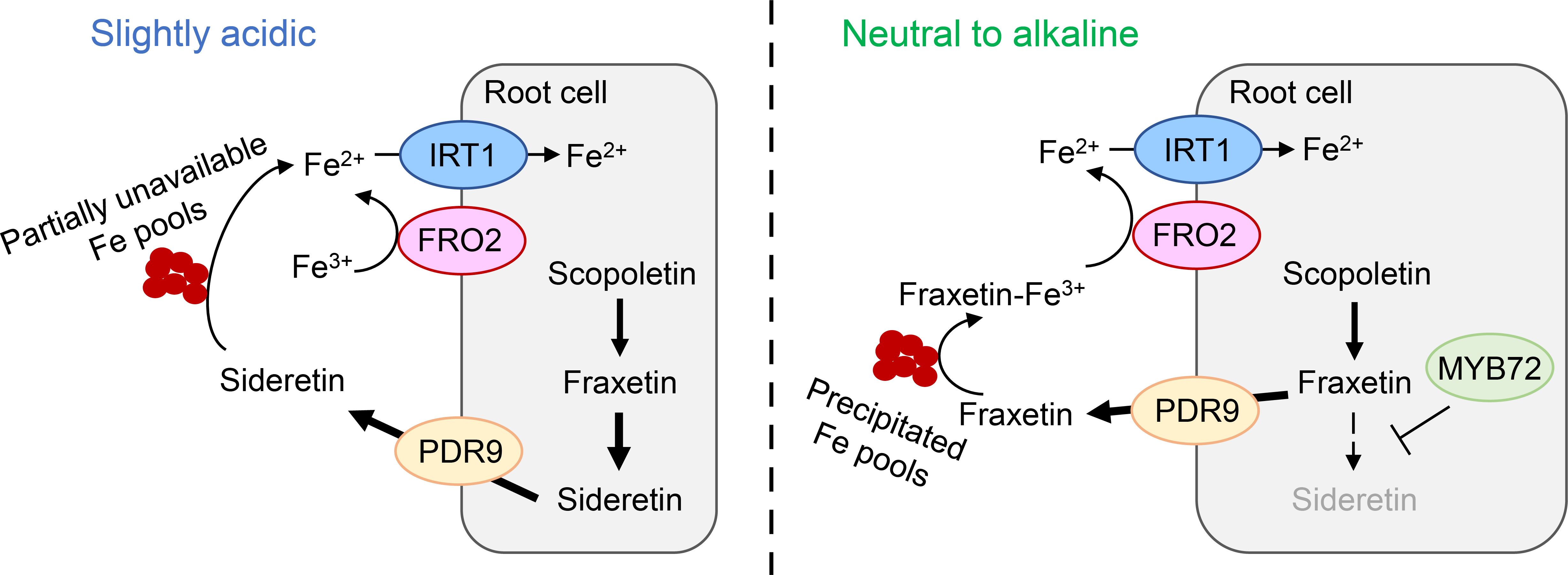 In ihrer Arbeit, die jetzt im Journal "The Plant Cell" veöffentlicht worden ist, konnten die Forscher zeigen, dass die Hauptfunktion von zwei durch Fe-Mangel induzierte Cumarinen weitgehend vom externen pH-Wert abhängt. Unter leicht sauren Bedingungen sind Cumarine, insbesondere Sideretin, für die Fe3+ Reduktion entscheidend. Hier wirkt Sideretin mit dem Enzym FERRIC REDUCTION OXIDASE 2 (FRO2) zusammen, um eine effiziente Fe2+ Aufnahme in die Wurzeln zu ermöglichen. Bei alkalischen pH-Werten wird die Synthese von Cumarinen gezielt verändert. Das Forschungsteam stellte fest, dass der Transkriptionsfaktor MYB72 eine Verschiebung des Cumarins Sideretin zu Fraxetin steuert. Bei einem alkalischem pH-Wert verliert Sideretin sowohl seine Fähigkeit, Fe3+ zu reduzieren als auch aus ausgefällten Quellen löslich zu machen, während Fraxetin unter solchen pH-Bedingungen eine hohe Fe3+-Mobilisierungskapazität beibehält. Daher anstatt Fe3+ direkt zu reduzieren, besteht die Hauptfunktion von Fraxetin darin, lösliche Fe(III)-Chelate für die FRO2-vermittelte Reduktion bereitzustellen.