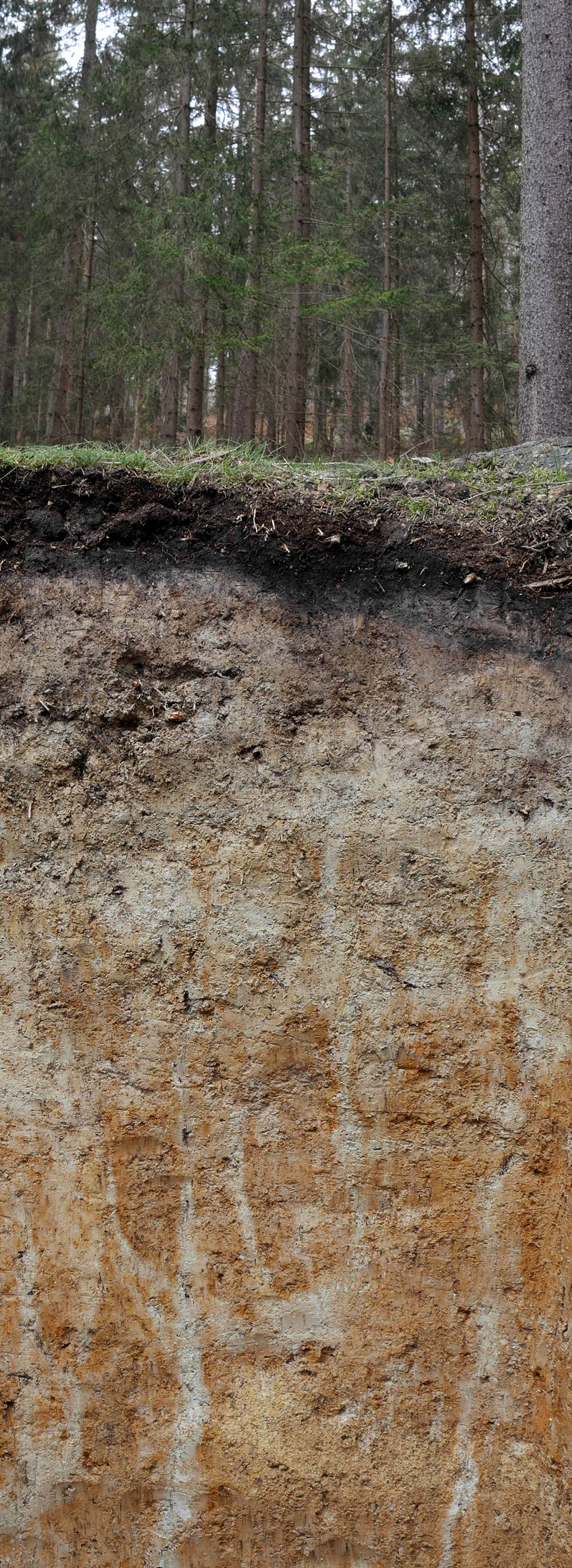 „Beim Waldboden aus dem Tharandter Wald handelt es sich um einen Boden, der durch periodisches Auftreten von Staunässe gekennzeichnet und daher für den Ackerbau seit jeher ungeeignet ist“, sagt Prof. Feger. Ursache für dieses Zuviel an Wasser sind stauende, meist tonige und stark verdichtete Schichten („Horizonte“) im Unterboden. Typisch sei der Wechsel von hellen und rostbraunen Flecken, die sogenannte „Marmorierung“. Fachleute bezeichnen diesen Bodentyp als Pseudogley. Er kommt in mitteleuropäischen Wäldern relativ häufig vor und ist schwierig zu bewirtschaften. „Die Staunässe führt zu Sauerstoffmangel im Wurzelraum. Damit kommen einige Baumarten, wie besonders die großflächig angebaute Fichte nicht gut zurecht. Sie reagiert mit einer ausgeprägten ‘Flachwurzeligkeit‘ auf Staunässe. Das macht sie anfällig für Windwurf und Trockenstress. „Das mag bei einem staunassen Boden paradox erscheinen. Aber in Trockenperioden, die aufgrund des Klimawandels immer häufiger auftreten, trocknet der durchwurzelte Oberboden stark aus“, erläutert Feger. So gebe es klare Zusammenhänge zu den Waldschäden der letzten Jahre. Ideal wäre auf solchen Standorten die Stieleiche, in höheren Lagen die Weißtanne. Beide heimische Baumarten können den verdichteten und wasserstauenden Unterboden im Gegensatz zur Fichte gut mit ihrem tiefreichenden Wurzelwerk erschließen.