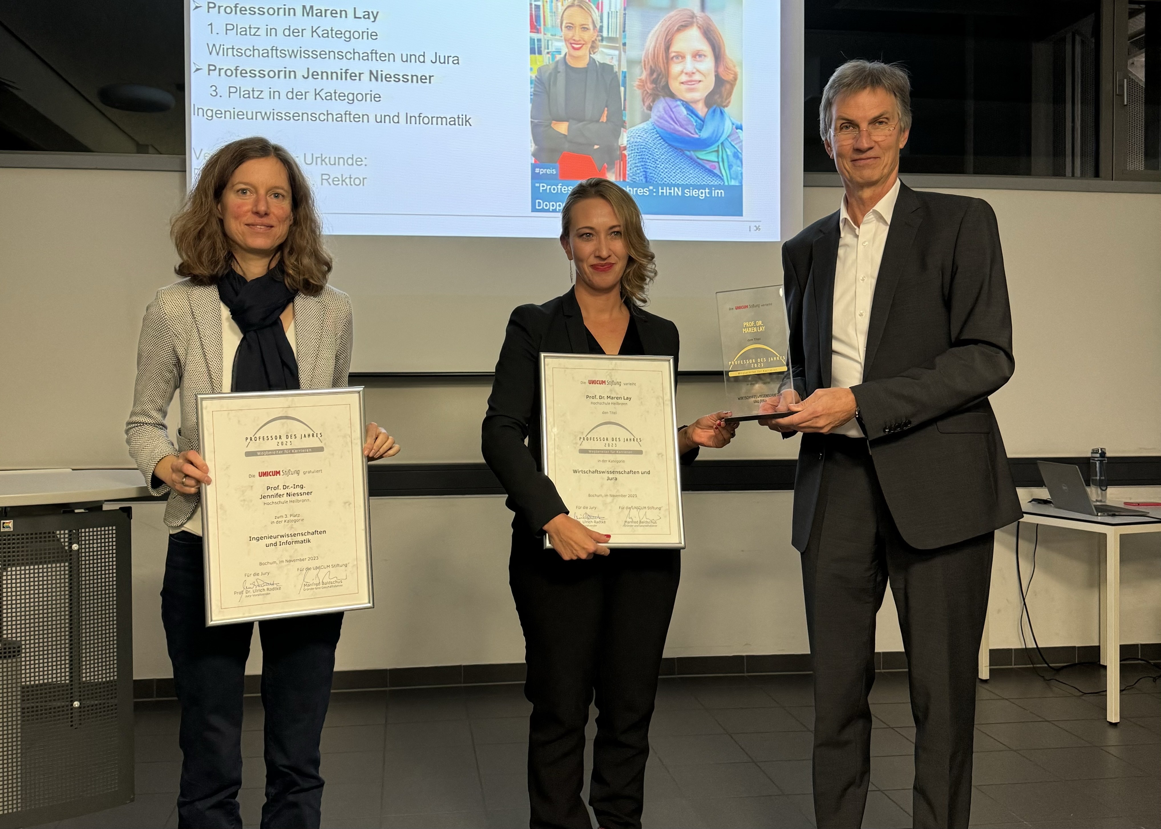 Heilbronn, Dezember 2023. Im Rahmen des Wettbewerbs "Professor des Jahres" der UNICUM Stiftung standen kürzlich gleich zwei Professorinnen der Hochschule Heilbronn (HHN) auf dem Siegertreppchen: Professorin Maren Lay sowie Professorin Jennifer Niessner. Das feiert die HHN, wobei Rektor der Hochschule Professor Oliver Lenzen in festlichem Rahmen die Sieger-Urkunden übergibt. Anschließend referieren die Professorinnen und geben Einblicke in ihre Tätigkeiten. Die Feierlichkeit bietet die Gelegenheit, mit beiden Wissenschaftlerinnen zu sprechen. Im Interview berichten Sie aus ihrer Welt der Wissenschaft und Lehre.