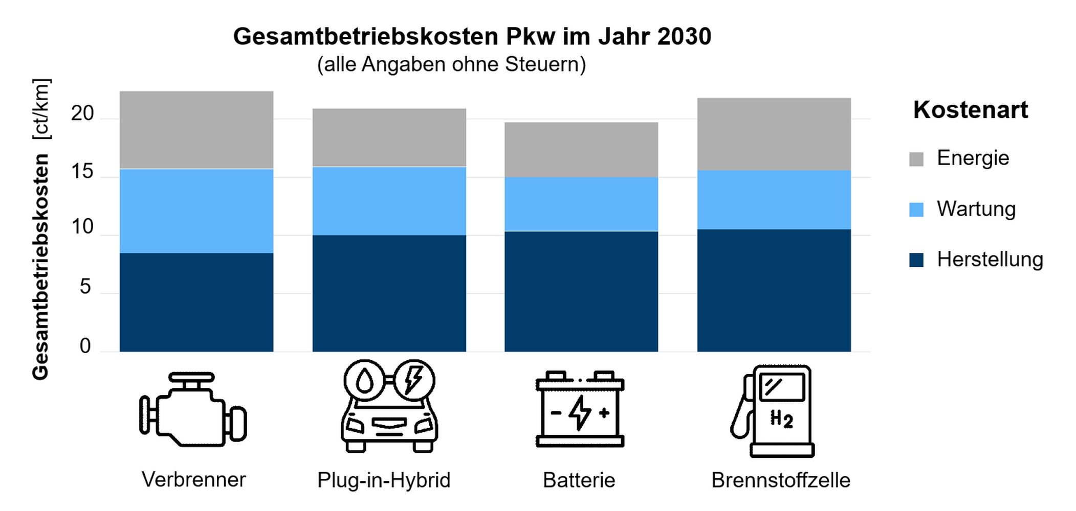 Die reinen Verbrauchskosten (ohne Steuern und Abgaben) von PKW mit Batterie und Brennstoffzelle werden gemäß der Studie im Jahr 2045 mit den heutigen vergleichbar sein. PKW-Fahrer:innen, die mit E-Fuels unterwegs sind, würden demgegenüber mit 60 bis 90 Prozent höheren Kosten rechnen müssen – und das obwohl die bestehende Versorgungsinfrastruktur von Flüssigkraftstoffen im Vergleich zu der von Strom und Wasserstoff günstiger ist und eine weltweite E-Fuel-Produktion an wind- und sonnenreichen Standorten angenommen wird.