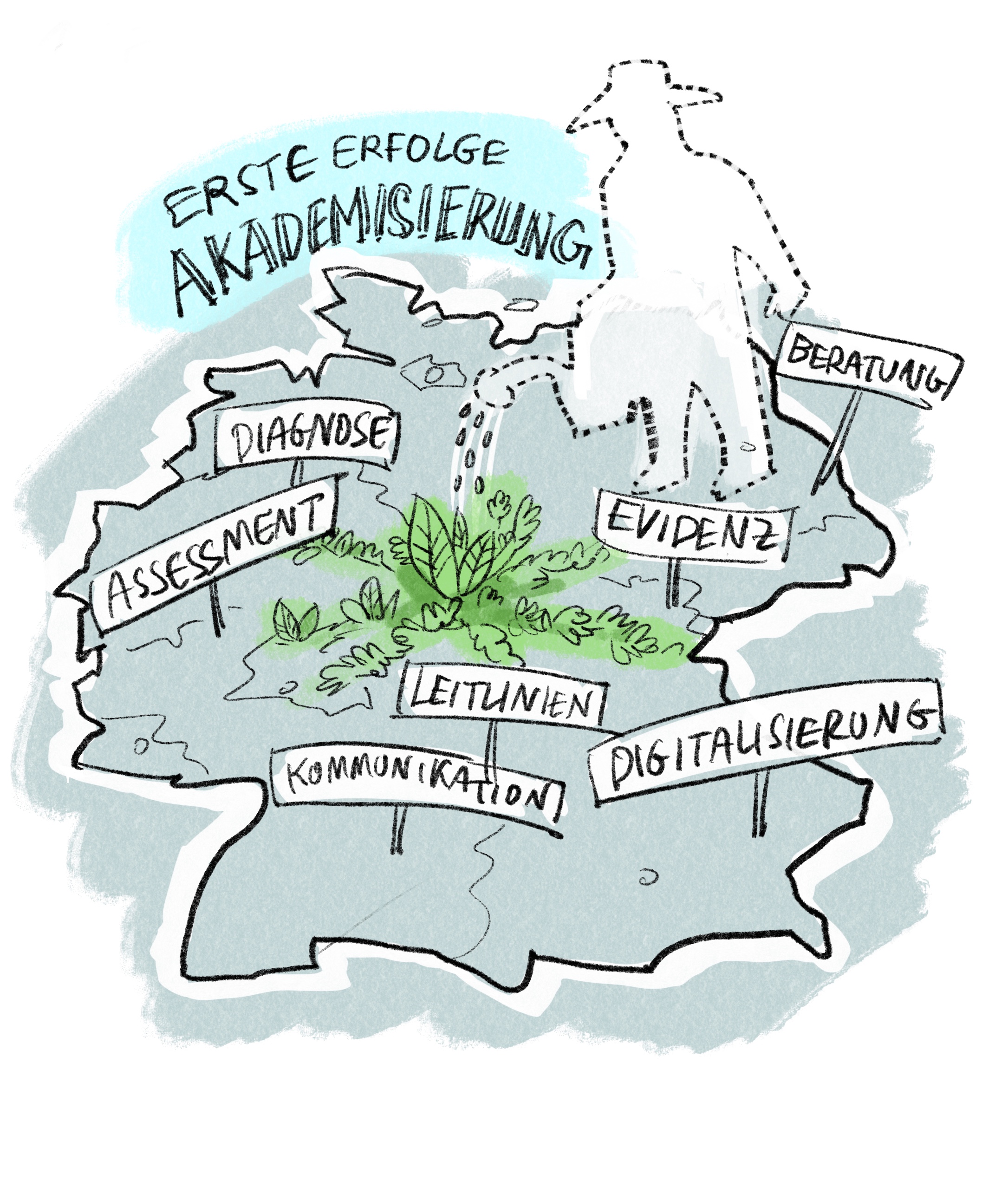 Prof. Dr. Christian Grüneberg und Marietta Handgraaf von der HS Gesundheit sowie Prof. Dr. Marion Grafe von der FH Münster haben die aktuellen Diskussionen zum Anlass genommen, gemeinsam mit dem Illustrator Björn von Schlippe die Argumente in Bildsprache zu übersetzen. Unter dem Titel „Über Irrwege zu einer besseren Versorgung unserer Patient*innen“ sollen die Illustrationen einen anderen Zugang zu bekannten Argumenten ermöglichen und die Forderung und Notwendigkeit einer Vollakademisierung unterstreichen. So zum Beispiel die Deutschlandkarte, in dessen Mitte ein „zartes Pflänzchen“ wächst. „Diese Pflanze steht sinnbildlich für die Akademisierung und dessen Einfluss auf die Versorgungspraxis“, so Marietta Handgraaf. „Diese Pflanze gilt es nun weiter zu pflegen, wobei aktuell nicht sichtbar ist, wer sich für diese Pflege verantwortlich zeigt“, so Marion Grafe von der FH Münster. Über die sozialen Medien der HS Gesundheit und der FH Münster werden in den kommenden Wochen regelmäßig neue Bilder erscheinen.