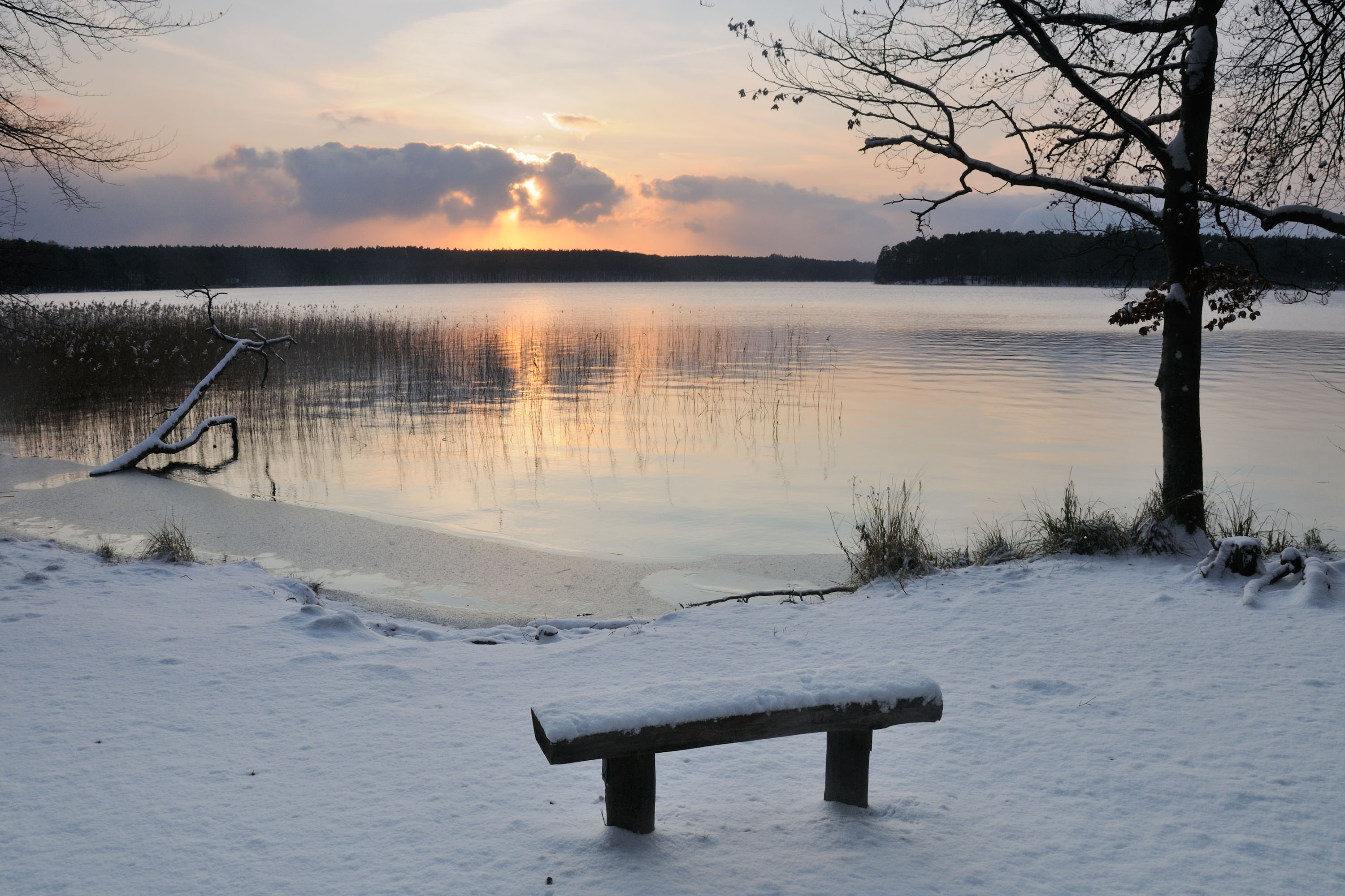 Wenn die Luft kälter wird, sinkt auch die Wassertemperatur. Aufgrund der besonderen Dichteeigenschaften des Wassers vermischen sich die Wasserschichten, bis das gesamte Gewässer eine Temperatur von 4°C erreicht hat. Wird es noch kälter, bildet sich eine Eisdecke, während das Wasser darunter bei vier Grad Celsius bleibt. In flacheren, gut durchmischten Seen kühlt das Wasser noch weiter ab; aber nur sehr flache Gewässer können bis zum Grund durchfrieren. Die bei uns heimischen Tiere und Pflanzen sind an diese Bedingungen angepasst. Viele Tiere nutzen auch den Gewässergrund, das Sediment, als Winterquartier. Es gibt aber auch kälteangepasste Organismen, wie einige Fischarten, die erst im Winter so richtig munter werden, oder aber im Winter aktiv fressen, wie Hechte.
