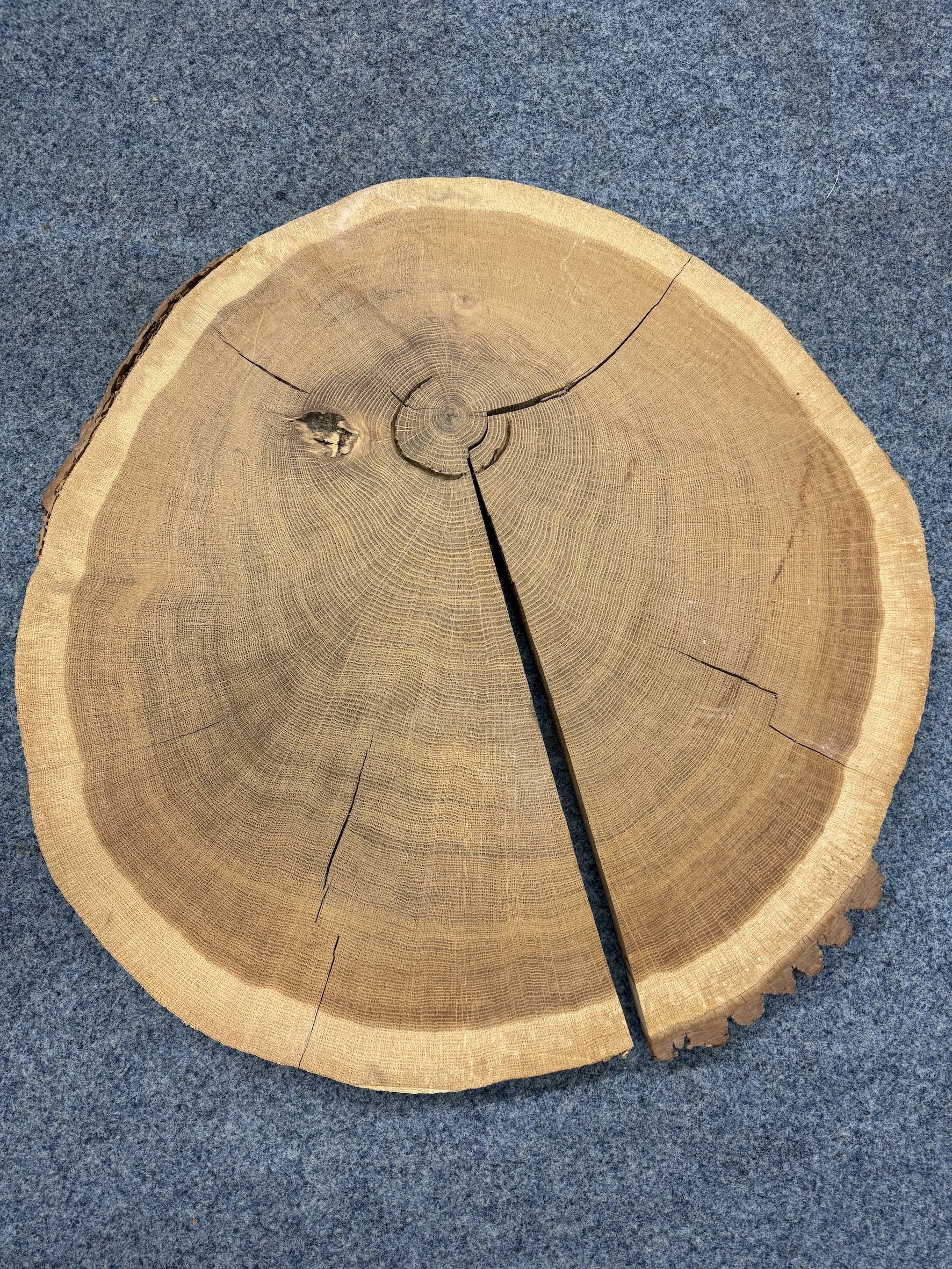 Baumscheibe einer Eiche aus Dransfeld/Deutschland mit 148 Jahresringen. Der tiefe Einschnitt bis in die Mitte zeigt die Position des für die Sauerstoffisotopenanalyse entnommenen Holzsegments (Bild: Gerhard Helle, GFZ)