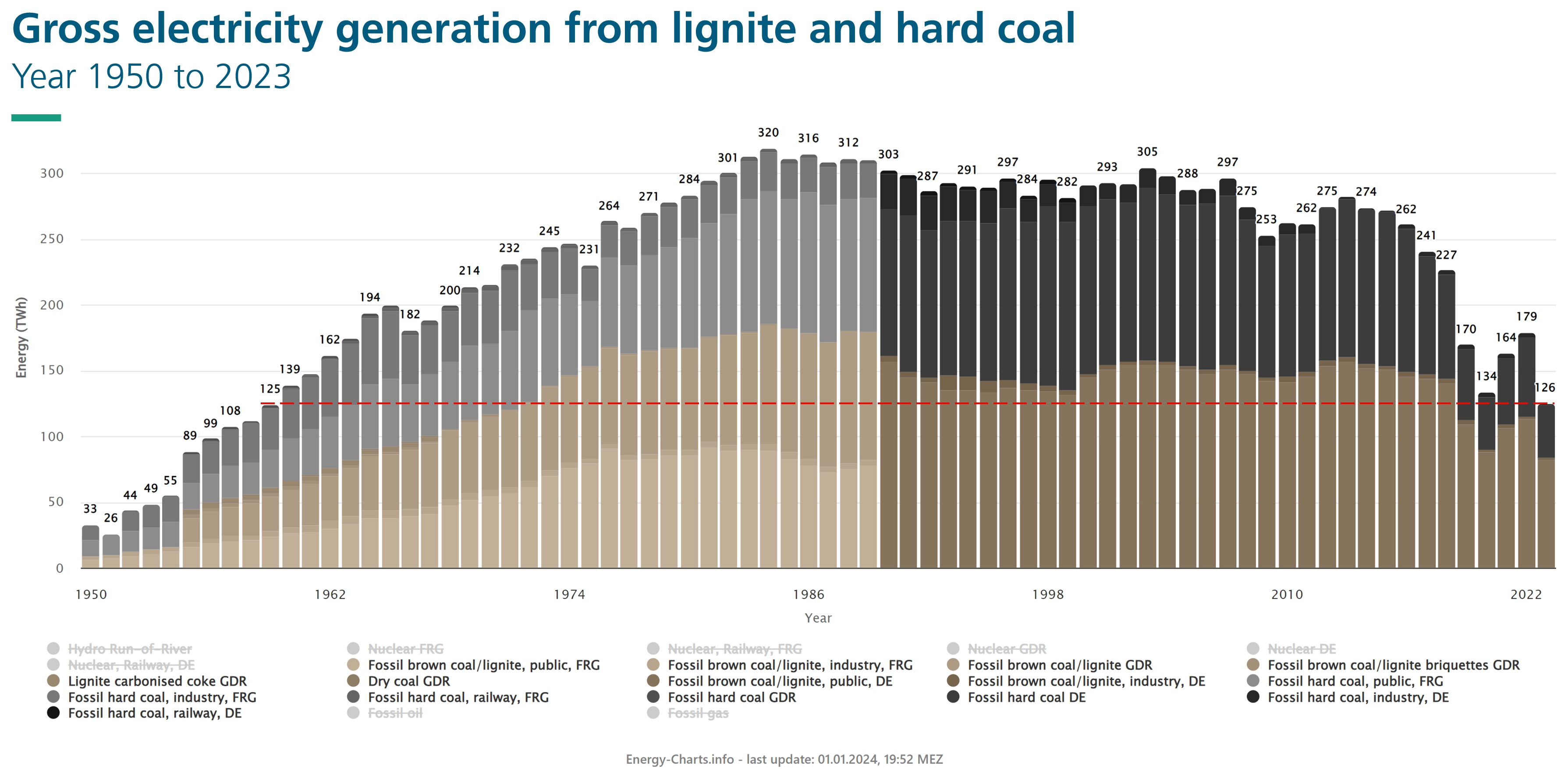 Overall, generation from lignite for public net electricity consumption fell by around 27%, from 105.9 TWh down to 77.5 TWh. Additionally, 3.7 TWh for industrial own consumption are added to this. Gross electricity generation fell to the level of 1963.