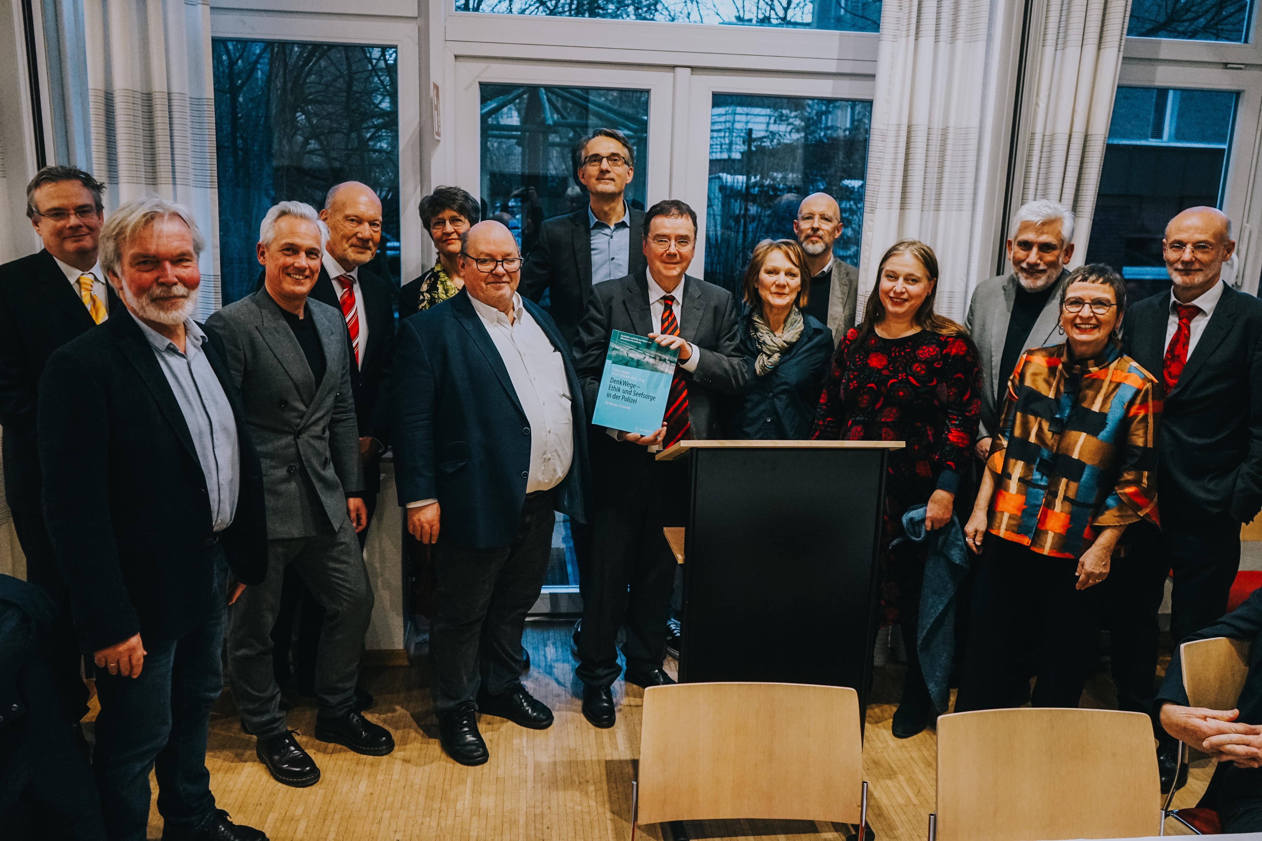 Im Rahmen des Festakts zu seiner Verabschiedung überreichten die Herausgeber Prof. Dr. Tobias Trappe und Prof. Dr. Peter Schröder-Bäck von der Hochschule für Polizei und Öffentliche Verwaltung (HSPV NRW) eine Dankesschrift mit dem Titel „DenkWege – Ethik und Seelsorge in der Polizei“ als Überraschung für Werner Schiewek.
