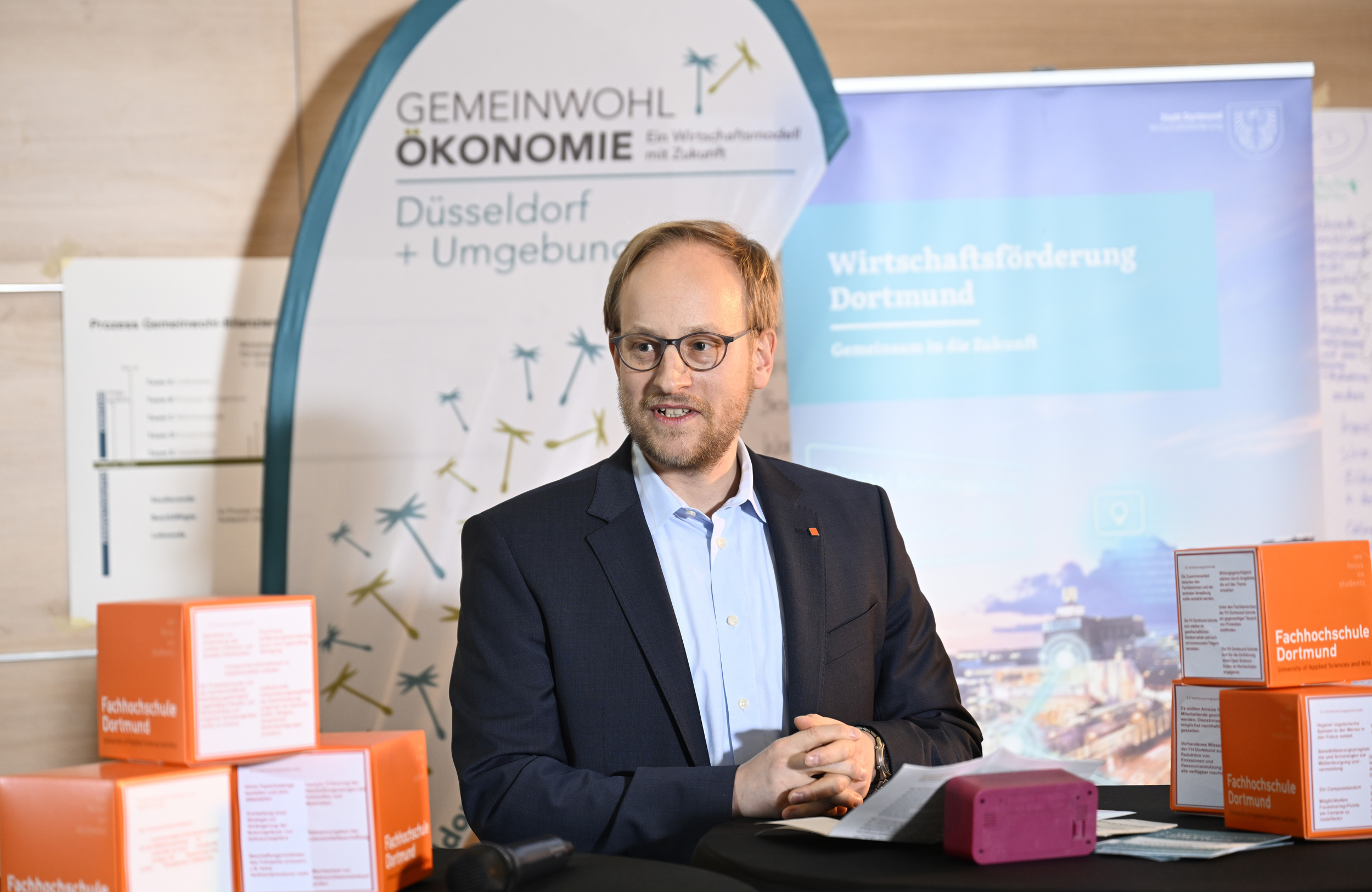 Die Gemeinwohlbilanz kann dabei unterstützen. Sie veranschaulicht die Auswirkungen der Unternehmensaktivitäten auf das Gemeinwohl. Die sogenannte Gemeinwohl-Matrix betrachtet dabei detailliert, wie universelle Werte (Menschwürde, Solidarität, ökologische Nachhaltigkeit und Mitbestimmung) im Unternehmen verankert sind – sei es im Umgang mit Mitarbeitenden, mit Kunden, Lieferanten oder dem gesellschaftlichen Umfeld. Die Bilanz zeigt nicht nur den Ist-Zustand auf, sondert arbeitet zugleich Handlungsempfehlungen heraus. „Für die FH Dortmund ist die Gemeinwohlbilanz daher der Startpunkt für eine umfassende Nachhaltigkeitsstrategie“, verspricht Franz Vogler.