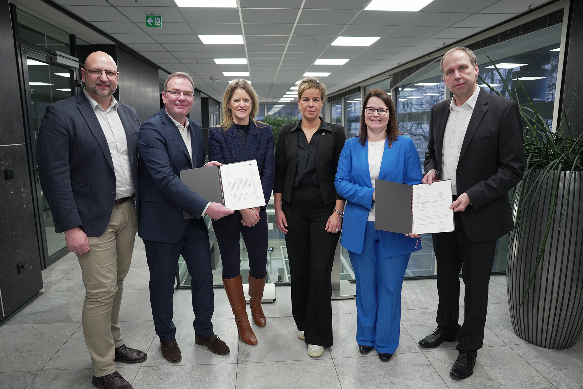 Der Förderantrag wurde in enger Kooperation mit der „IMPULS – die Hammer Wirtschaftsagentur“ ausgearbeitet. Am Dienstag, 23. Januar 2024 übergab die Ministerin für Wirtschaft, Industrie, Klimaschutz und Energie des Landes Nordrhein-Westfalen, Mona Neubaur, die Zuwendungsbescheide an die HSHL-Präsidentin Prof. Dr.-Ing. Kira Kastell, Pascal Ledune, Geschäftsführer von IMPULS und zwei der Initiatoren des Projekts, Prof. Dr.-Ing. Torsten Cziesla und Prof. Dr. Jens Thorn sowie HSHL-Kanzlerin Sandra Schlösser. Ministerin Neubaur: „Ich freue mich, dass ein so innovatives Vorhaben im 5-StandorteProgramm jetzt an den Start gehen kann. Das Vorhaben ‚Werkbank Sektorenkopplung‘ wird einen wichtigen Beitrag dazu leisten, unsere Energiesysteme klimaneutral zu entwickeln. Ich bin überzeugt, dass das Vorhaben die Transformation zu einer klimaneutralen Wirtschaft maßgeblich vorantreibt.“