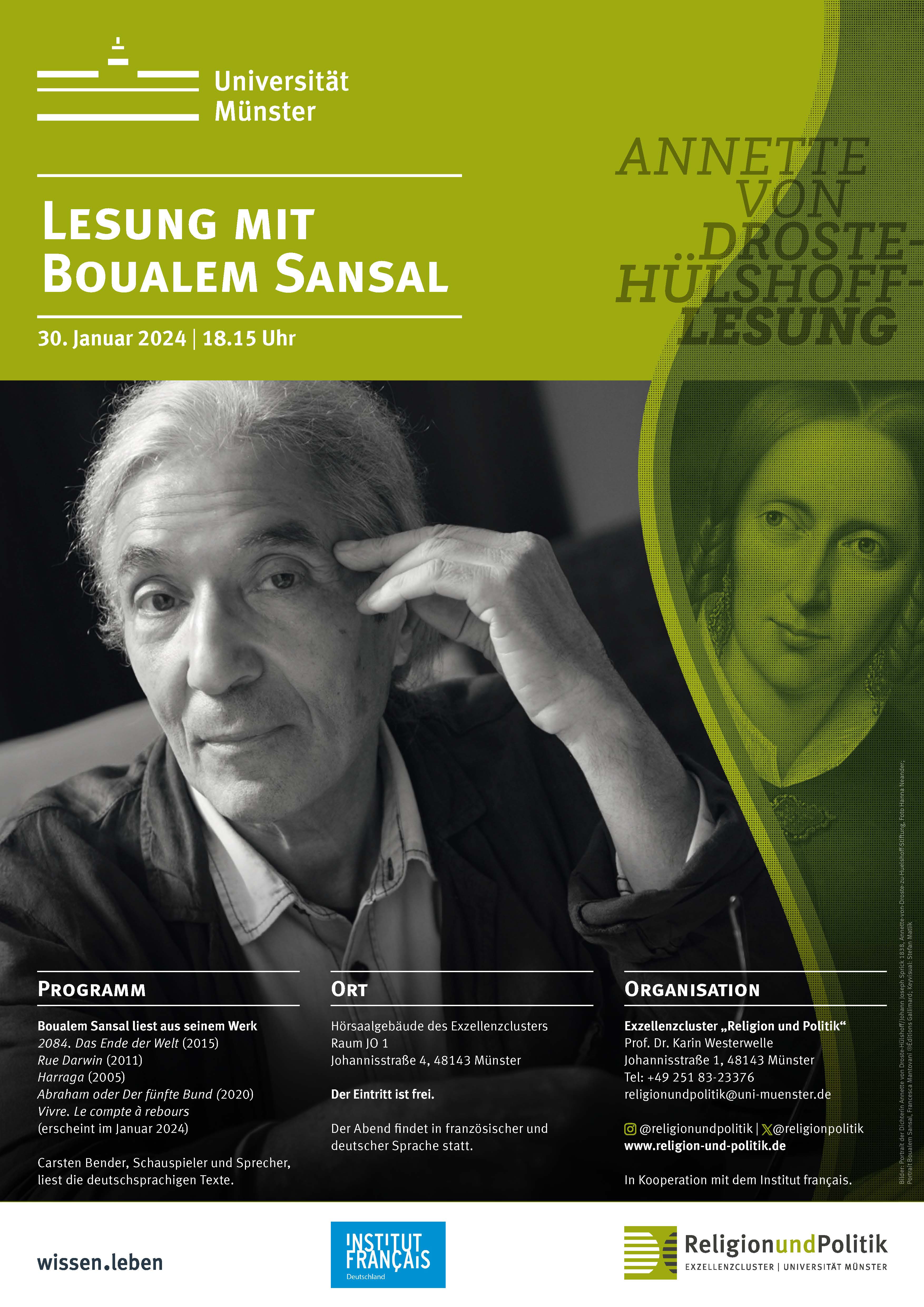 First Annette von Droste-Hülshoff reading – Cluster of Excellence “Religion and Politics” at the University of Münster invites writers from around the world to read from their work – Reading and discussion with Algerian writer Boualem Sansal on 30 January – He critically examines relations between politics and religion in Islamist and totalitarian regimes