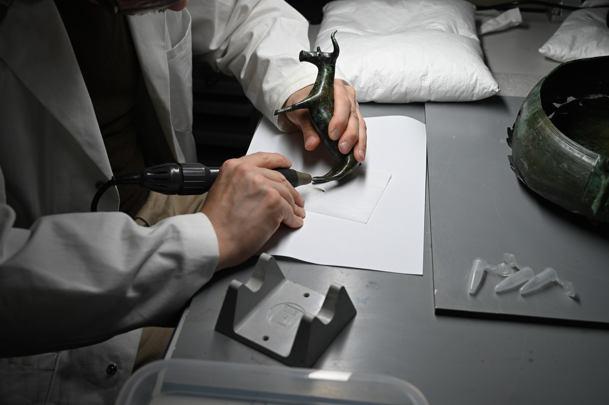 Die Untersuchung des Metalls erfolgte mittels sogenannter Röntgenfluoreszenz- und Massenspektrometer-Analysen. Erstere analysiert die Mengengehalte der Haupt-, Neben-, und Spurenelemente im Metall, wie etwa Zinn, Blei oder Arsen, zweitere bestimmt die Bleiisotopenverhältnisse des Kupfers, die herangezogen werden, um die Herkunft des Rohmetalls zu bestimmen. So konnte schließlich festgestellt werden, aus welchen Bergbauregionen das Kupfer kam und wie es mit Zinn zu Bronze wurde.