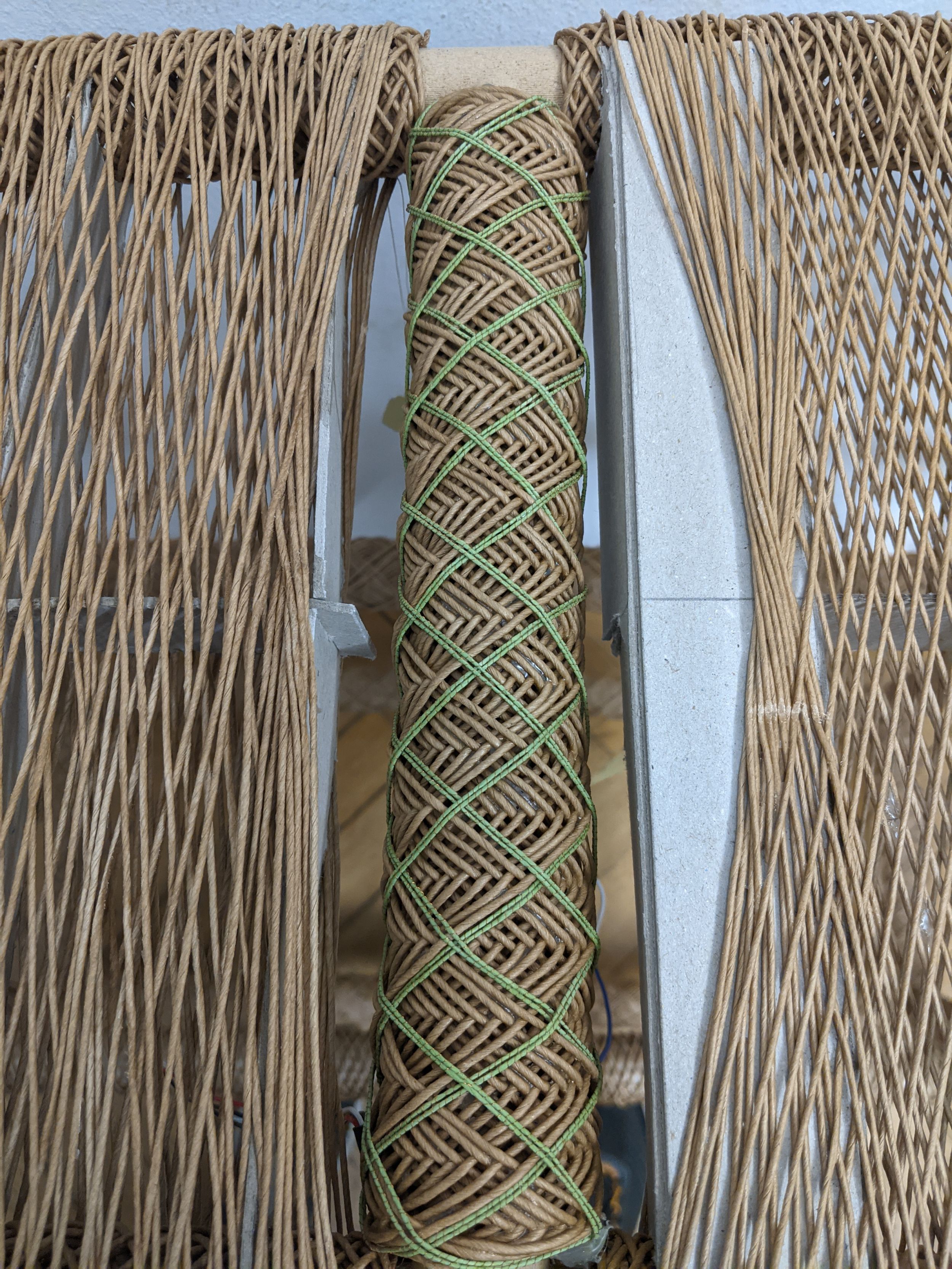Die ungewöhnliche Optik entsteht im Strukturspulprozess. Bei dieser an den DITF entwickelten Technologie wird das Garn präzise auf einem rotierenden Dornkörper abgelegt. So sind hohe Prozessgeschwindigkeiten und hohe Automatisierungsgrade möglich. Nach dem Spulvorgang werden die einzelnen Garne fixiert, wodurch ein selbsttragendes Bauteil entsteht. Für die Fixierung wurde im Projekt ein stärkebasierter Klebstoff eingesetzt, der ebenfalls aus nachwachsenden und abbaubaren Rohstoffen besteht.