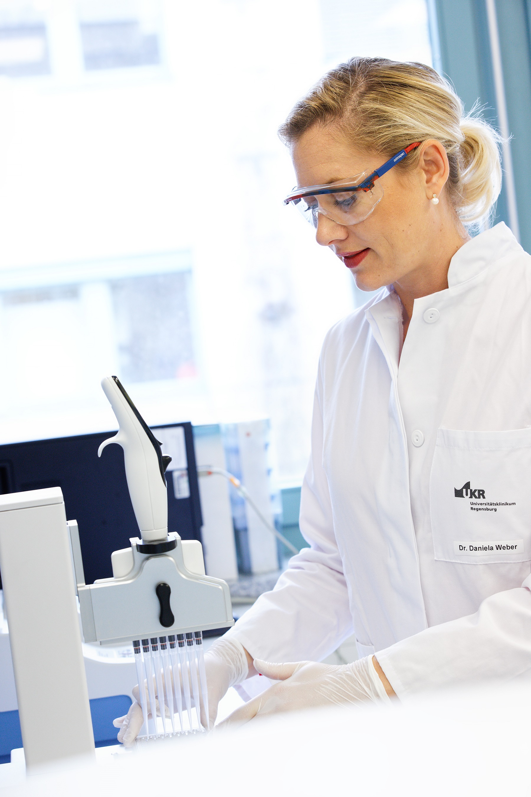 Klinik, Forschung, Familie: All dies ist nicht wegzudenken aus dem Alltag von Professor Dr. Daniela Weber. Ein Fulltime-Job. Reichen zur Bewältigung tatsächlich 24 Stunden aus? „Mein Mann und ich müssen uns durchaus gut abstimmen, aber es geht. Organisation ist das A und O“, lacht die Funktionsoberärztin der Klinik und Poliklinik für Innere Medizin III des UKR. Sich nach der Geburt ihres zweiten Kindes im März 2022 aus der Patientenversorgung oder der Forschung zurückzuziehen, kam für die 38-Jährige dennoch nicht in Frage. Dafür macht ihr ihre Arbeit einfach zu viel Spaß. Der Umgang mit den Patienten, das Einbringen der wissenschaftlichen Ergebnisse in die tägliche klinische Arbeit. Einfach alles. „Für mich steht der Mensch im Mittelpunkt. Ich habe zu den meisten Patienten ein Gesicht vor Augen. Nur im Labor zu arbeiten, war deshalb keine Option für mich“, so Professor Weber.