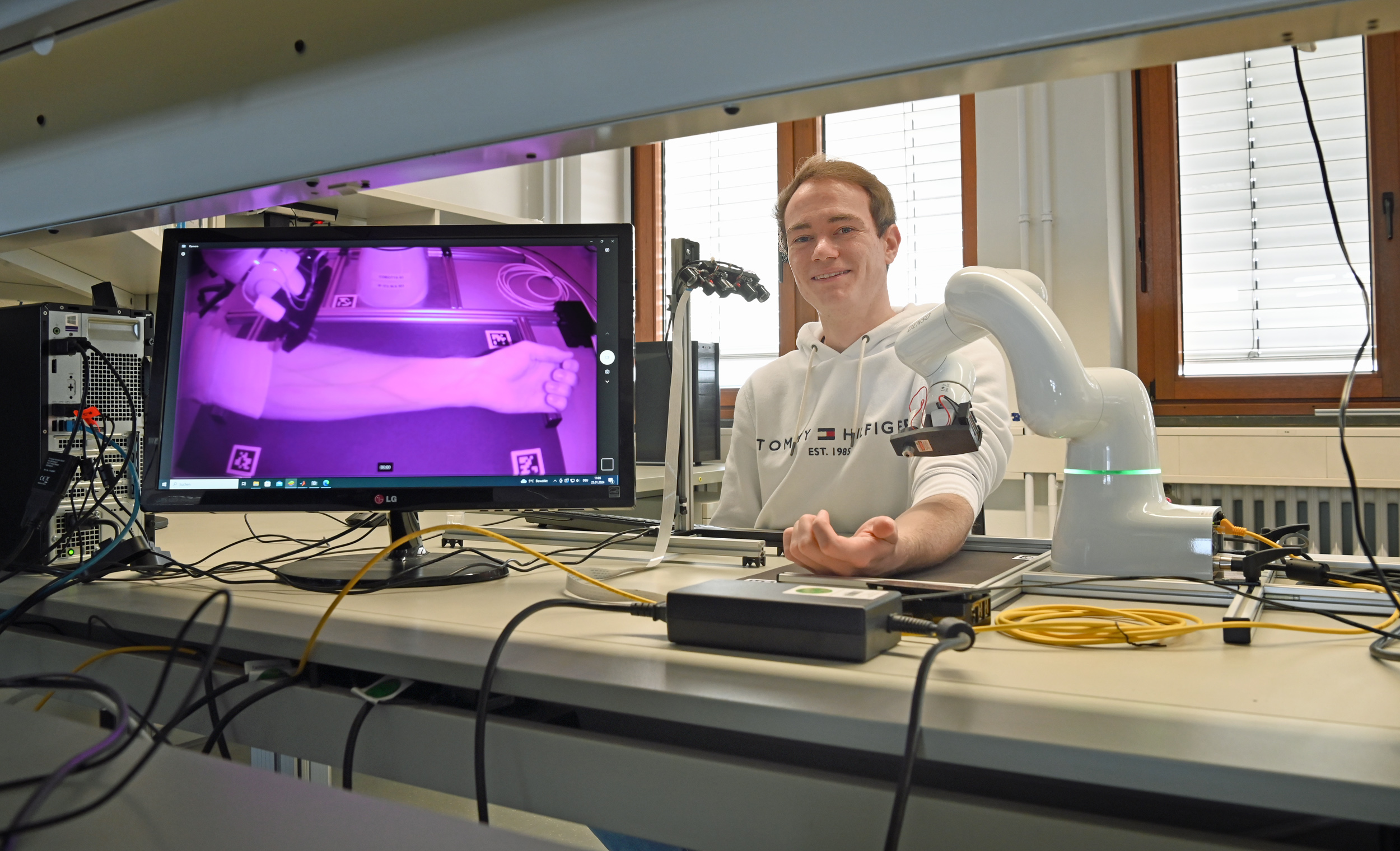 Zweiter Schritt: der Nadelstich. Dazu muss die Vene nicht nur erkannt, sondern auch deren Verlauf dargestellt und der Winkel für die Nadel definiert werden. Eine Herausforderung. „Der Versuchsaufbau mit dem Roboterarm hat hier noch Ungenauigkeiten, die in einem fertigen System nicht mehr sein dürfen“, räumt Aron Hemmis ein. Aber: Der Test zeige auch, „dass trotz der Verwendung günstiger Hardwarekomponenten brauchbare Ergebnisse erzielt werden können, die die Realisierbarkeit eines solchen Systems beweisen.“ So steht es im Fazit seiner Bachelorarbeit. Bis zum Einsatz in Arztpraxen und Krankenwagen sei dennoch einiges an Forschung nötig.