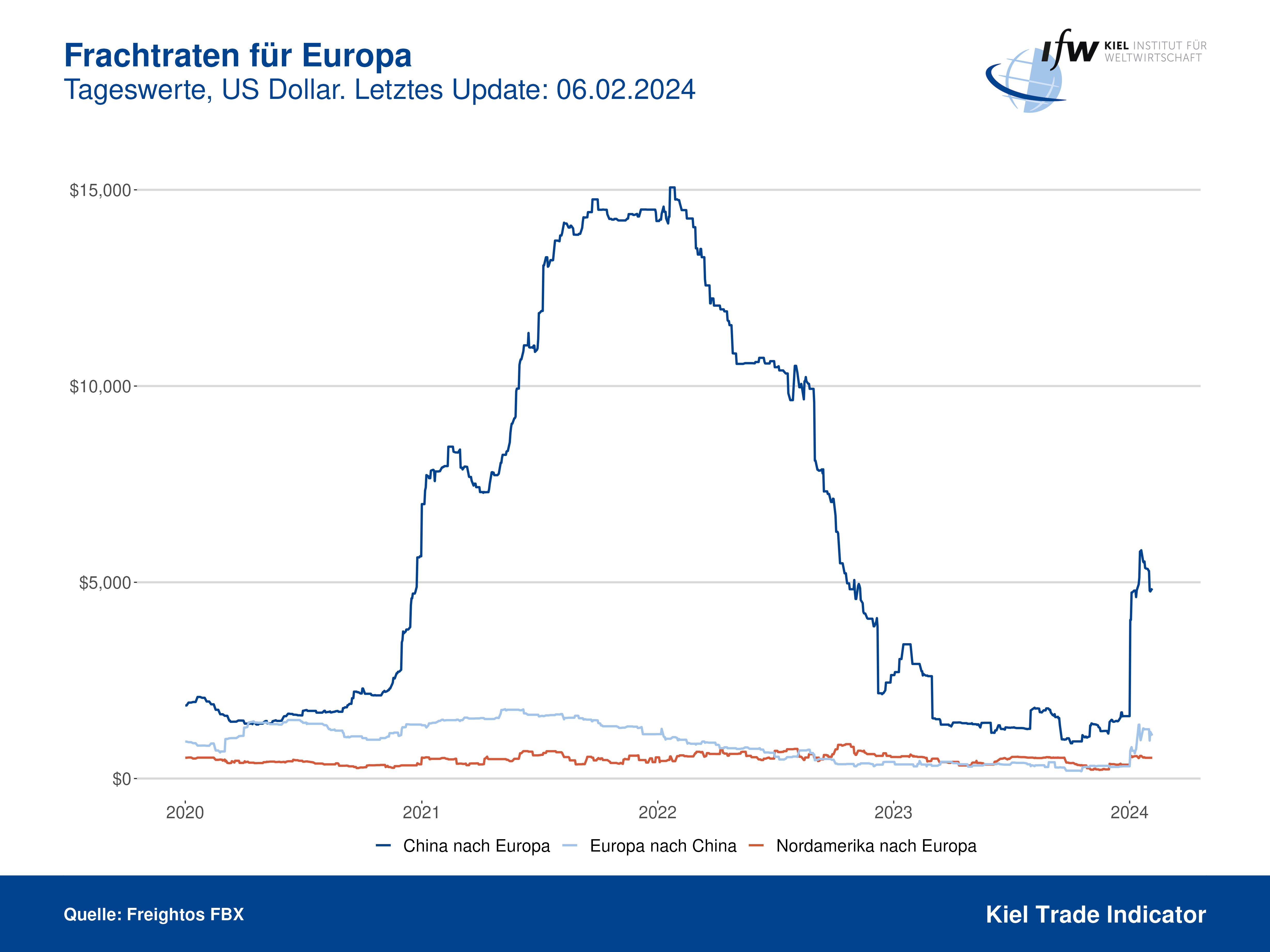 Die Frachtraten auf dem Wege von China nach Europa – diese Route führte bislang durchs Rote Meer und den Suezkanal – sind unterdessen deutlich gestiegen. Im Januar kostet der Transport eines Standardcontainers zwischenzeitlich über 5.000 US-Dollar und sind seitdem wieder rund 15 Prozent gesunken. Ende 2023 waren es rund 1.500 US-Dollar. Die Preise liegen gegenwärtig aber immer noch weit unter den Rekordwerten von 2022, wo knapp 15.000 US-Dollar erreicht wurden.