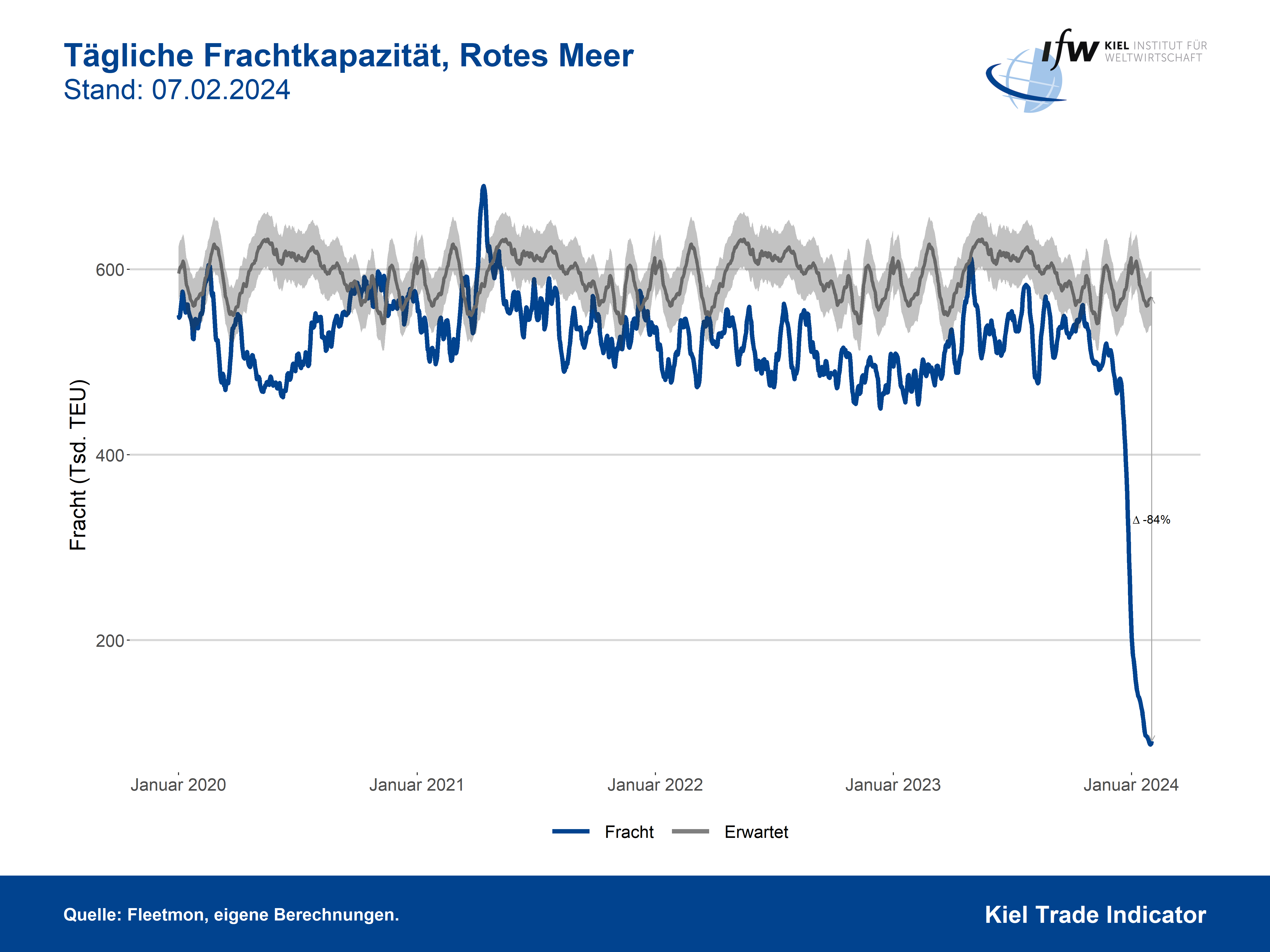 Kiel Trade Indicator 1/24: Frachtmenge im Roten Meer geht weiter zurück, weniger Schiffe in Hamburg