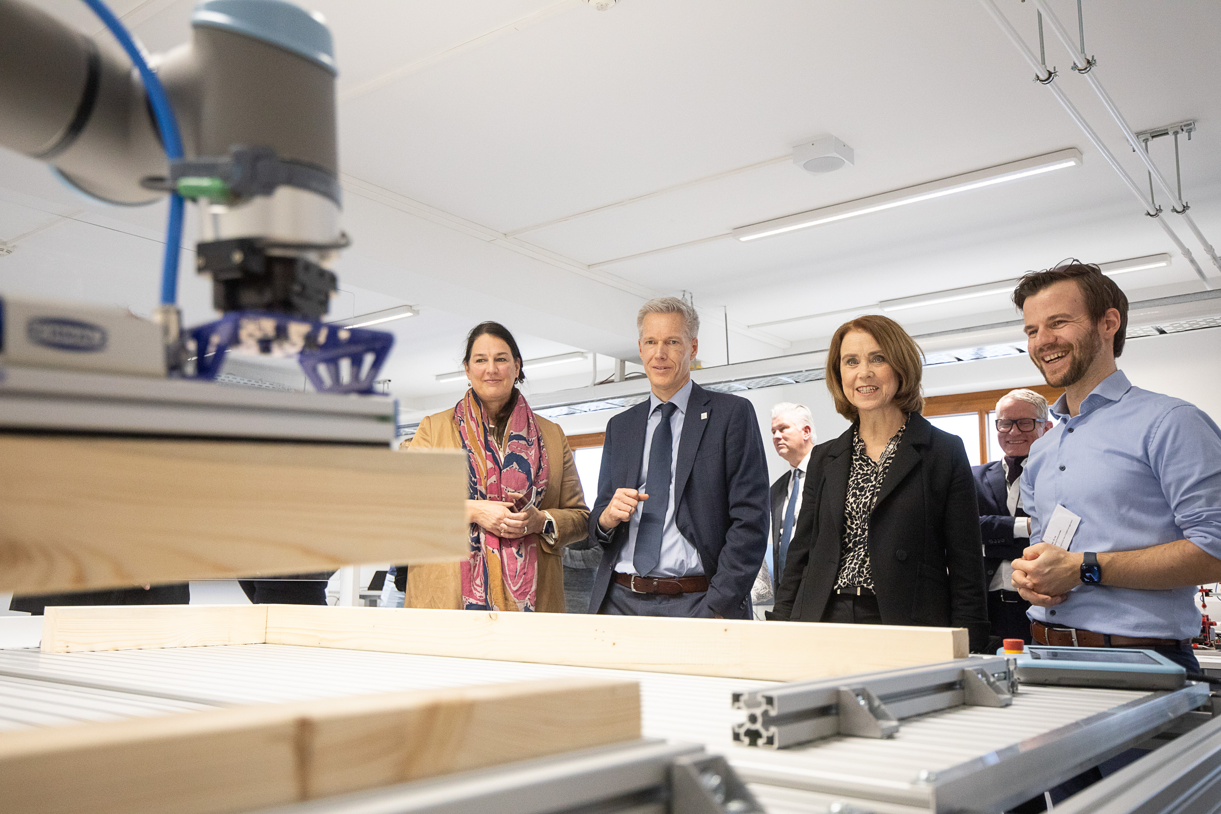 Doch sollten Wissenschaftsministerin Petra Olschowski und Bundestagsabgeordnete Dr. Anja Reinalter nicht nur hören, wie die Hochschule Biberach aufgestellt ist, sondern selbst erleben, was ein modernes Studium im Bereich Bauwesen bedeutet. Und so erhielten die Politikerinnen eine exklusive Führung durch das Laboratory for innovative Construction and Projectmanagement (LiCoP). Hier bewegten sie sich durch die Arbeitswelt von morgen, beobachteten einen Roboter, der mit seinem Greifarm automatisch und präzise komplexe Bauteile vormontiert, und mit VR-Brillen ausgestattet durchschritten sie schließlich den Campus Zukunft, eine Projektarbeit von Studierenden. Mit viel Engagement, so berichtet Jonas Hartung, hätten sie als studentisches Team die virtuelle Realität im Vorfeld aufgebaut. In einer Kombination aus visueller Gestaltung und Programmierung ist den Studierenden ein Metaverse gelungen, in dem der Standort dreidimensional erscheint. „Das Modell zeigt, wie wichtig und realitätsnah digitales Planen ist und lässt erkennen, welches Potenzial Technologien haben und wie Innovationen unseren Alltag verändern“, so der Student, der im 5. Semester Bau-Projektmanagement studiert.