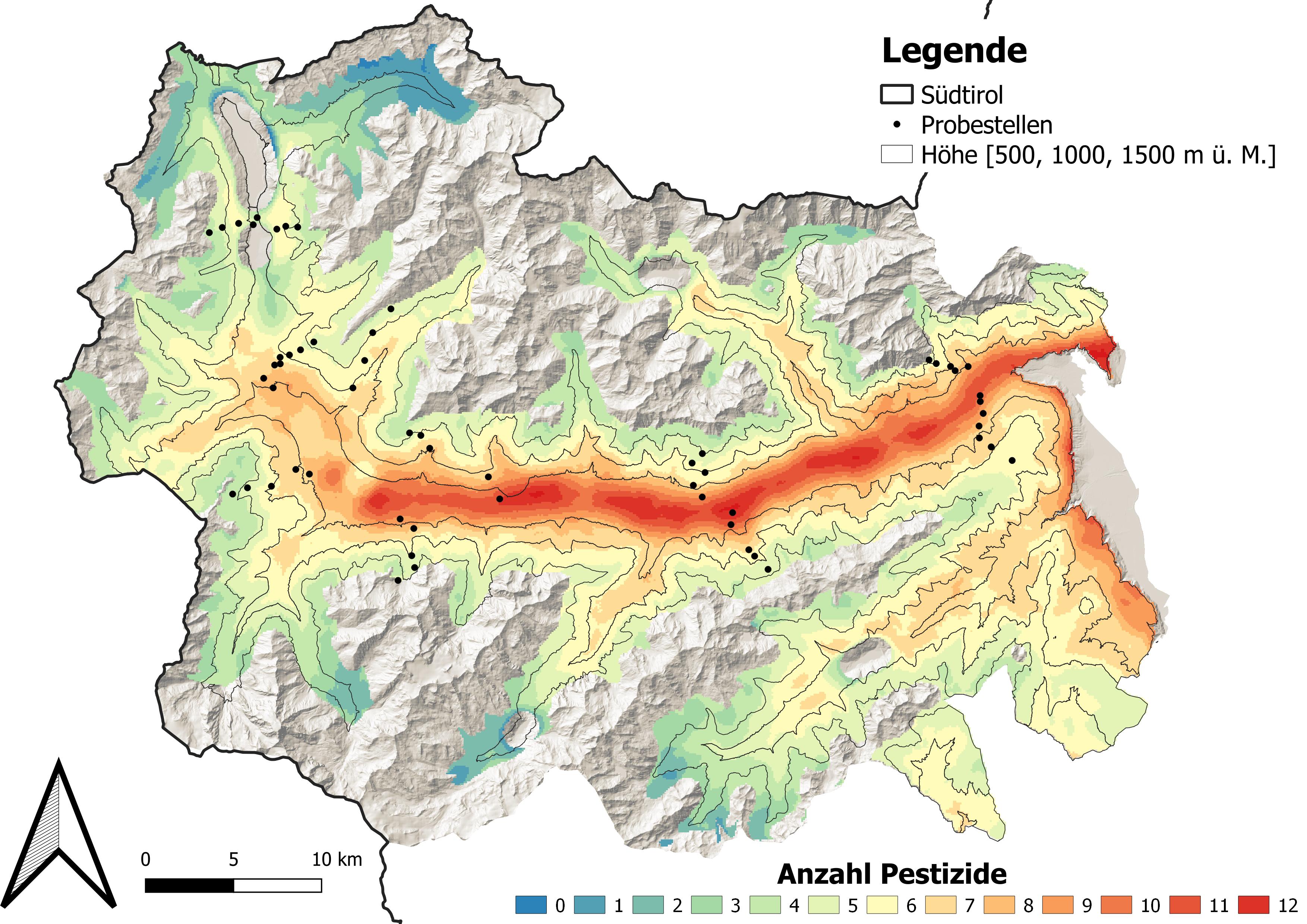 „Aus ökotoxikologischer Sicht ist das Vinschgauer Tal besonders interessant, da man im Tal hochintensiven Anbau mit vielen Pestiziden hat und auf den Bergen empfindliche alpine Ökosysteme, die teilweise auch streng geschützt sind“, erläutert Brühl. Gemeinsam mit seinem Team sowie Fachkollegen der BOKU und aus Südtirol hat er die Pestizid-Belastung auf Landschaftsebene untersucht – entlang des ganzen Tals bis in Höhenlagen. Den Verbleib von Pestiziden auf so großer Skala systematisch aufzunehmen und darzustellen ist ein Novum in den Umweltwissenschaften. Für ihre Studie haben die Forscher insgesamt elf sogenannte Höhentransekte entlang der gesamten Talachse untersucht, Strecken, die sich vom Talboden von 500 Metern Seehöhe bis auf die Berggipfel mit 2.300 Metern erstrecken. Entlang dieser Höhentransekte entnahm das Team auf Höhenstufen alle 300 Meter Untersuchungsmaterial. An insgesamt 53 Standorten wurden so Pflanzenmaterial gesammelt und Bodenproben gezogen.