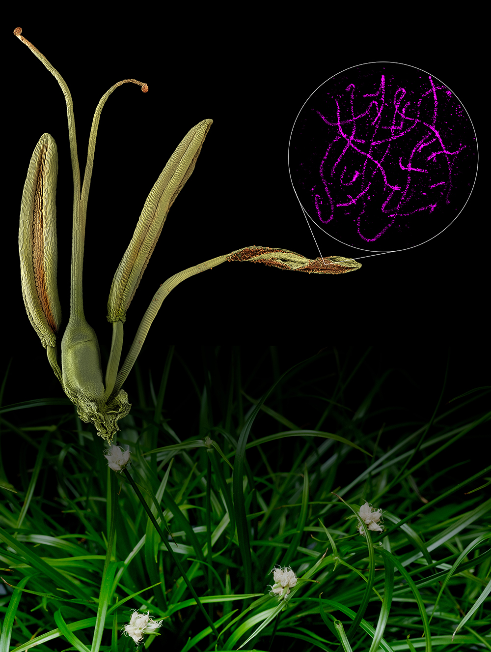 Für ihre Studie nutzten die Forschenden die Schnabelriede, eine grasartige Blütenpflanze (Rhynchospora breviuscula), ein hervorragendes natürliches Werkzeug zur Untersuchung der Entstehung genetischer Rekombination. Die Modellpflanze besteht im Gegensatz zu Pflanzen deren Chromosomen nur ein Zentromer besitzen (monozentrische Pflanzen) aus Chromosomen mit Hunderten von kleinen Zentromeren, die in einer Linie über das Chromosom angeordnet sind. Mit diesem so genannten holozentrischen Chromosomen schließen die Forschenden den Einfluss eines lokalisierten Zentromers ebenso aus, wie die in Abschnitte unterteilte Organisation eines Chromosoms, bei der Zentromere und Gene gleichmäßig über das Chromosom verteilt sind.