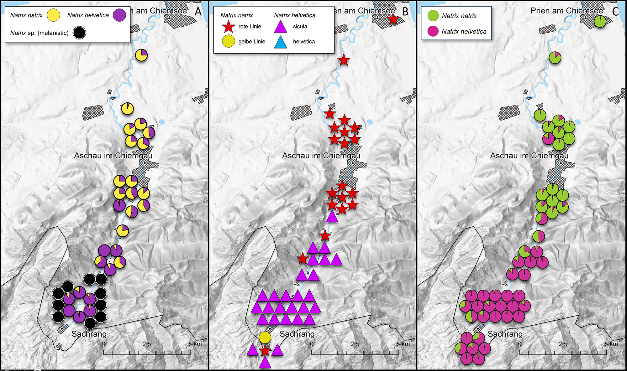Das Forschungsteam aus München und Dresden hat in einer neuen Studie das Gebiet, in dem die Italienische Barrenringelnatter (Natrix helvetica sicula) und die Ringelnatter (Natrix natrix) aufeinandertreffen, genauer untersucht. Um die Hybridzone der beiden Schlangenarten genauer zu verstehen, untersuchte das Team zwei genetische Marker (DNA aus den Mitochondrien und Mikrosatelliten aus dem Zellkern) und die Zeichnungsmuster auf Kopf und Körper von 49 Nattern aus dem Priental. Dabei stellte sich heraus, dass im oberen Priental vor allem reine oder fast reine Barrenringelnattern vorkommen, im unteren Priental zum Chiemsee hin dagegen reine oder fast reine Ringelnattern.