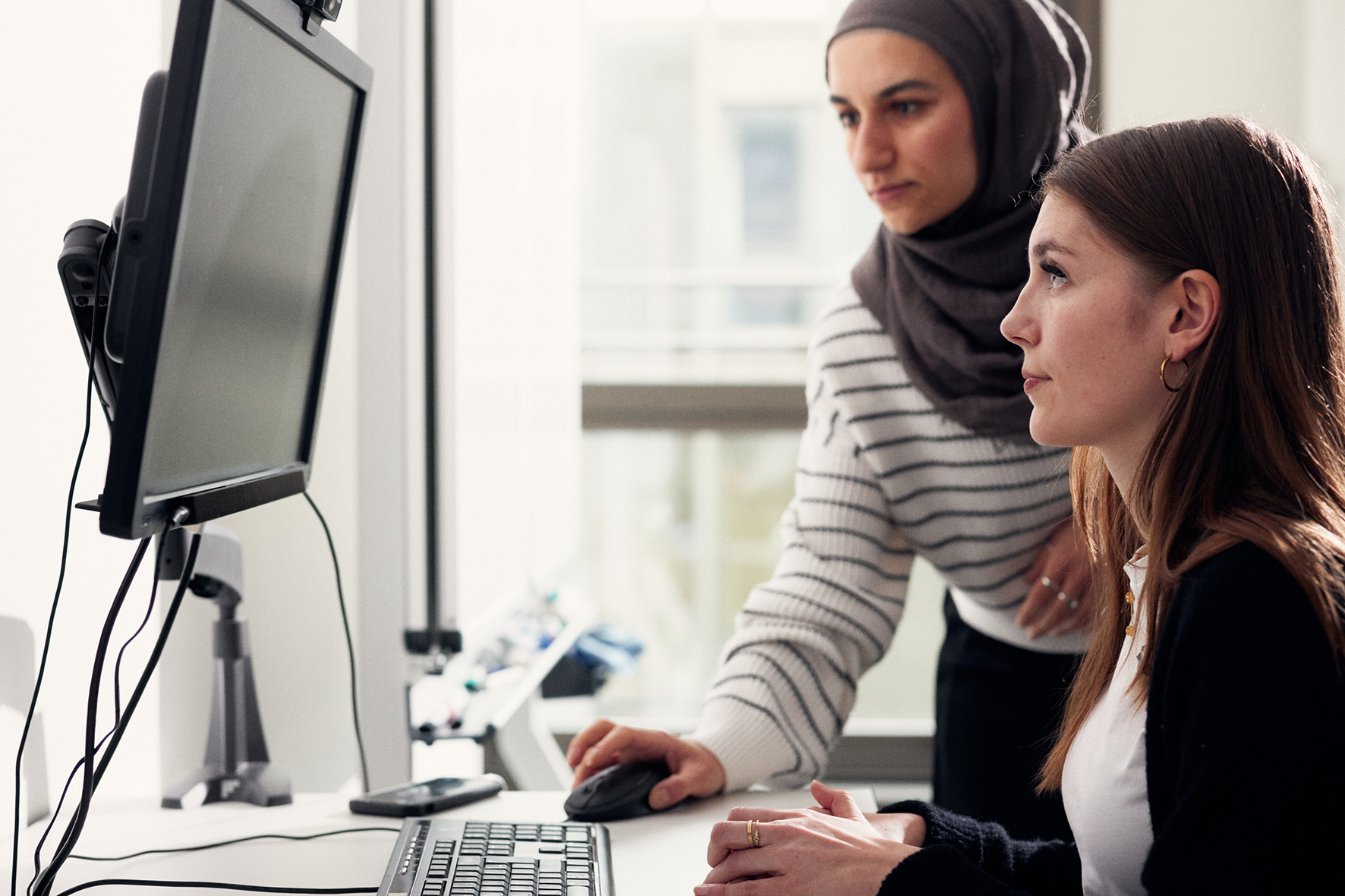 Elif Durmaz untersuchte im vergangenen Jahr im Wirtschaftspsychologischen Labor der HSBI mit solchen Experimenten, welchen Einfluss unterschiedliche Reaktionen muslimischer Organisationen auf Terroranschläge auf die Aufmerksamkeit der Rezipientinnen und Rezipienten haben. An diesem Tag im April hatte sie jedoch keine „normale“ Probandin zu Gast, sondern Eliza Starke – ebenfalls Mitarbeiterin im Fachbereich Wirtschaft, genauer gesagt im Transferprojekt InCamS@BI – Innovation Campus for Sustainable Solutions. Die Doktorandin Starke bekam einen Einblick in die Forschungsweise des Labors, die sie für ihre eigene Arbeit nutzen möchte. Durmaz hat Erziehungswissenschaften in Bielefeld studiert und in Bonn zum Thema Mädchenarbeit geforscht. In ihrer Masterarbeit beschäftigte sich die gebürtige Kölnerin mit Radikalisierung auf Onlineplattformen und Chatprogrammen in Verknüpfung mit der Theorie der sozialen Anerkennung. „Mein Wissen über Radikalisierung und Extremismus ist sehr hilfreich für die Studie, die ich im Projekt OKAI an der HSBI durchgeführt habe“, erzählt Durmaz, die während der Projektlaufzeit an der HSBI tätig war.