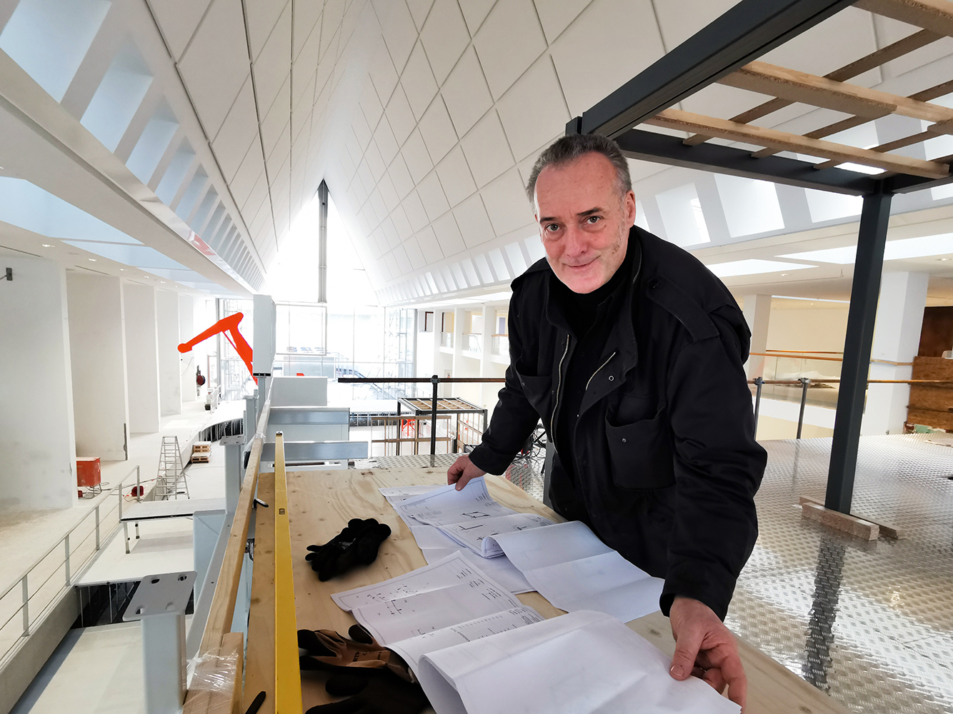 Jakob Florian Lehner has had a sailing licence since he was a teenager. Even back then, he knew how to skilfully steer the wind on Lake Starnberg into the sails of the family boat. Since November last year, he has been enjoying the fresh breeze on the North Sea - and building his first boat on land. "I've been screwing and repairing the sailing boat for many years, but now I'm working in a shipyard for the first time and building a ship," says Lehner with a smile. As site manager at Kubix, he is coordinating all the trades so that the research vessel installation is ready for exhibition. The keel has already been successfully laid. In the centre of the light-flooded extension, the stylised ship is taking shape day by day. The orange-red antennae and cranes bring back memories of the POLARSTERN. "The special thing is that we are consistently building an exhibit. Objects already exist in museums, of course, but we are now creating a building under construction," says Lehner, who has been coordinating exhibitions in museums and at trade fairs in Germany and abroad for 30 years.