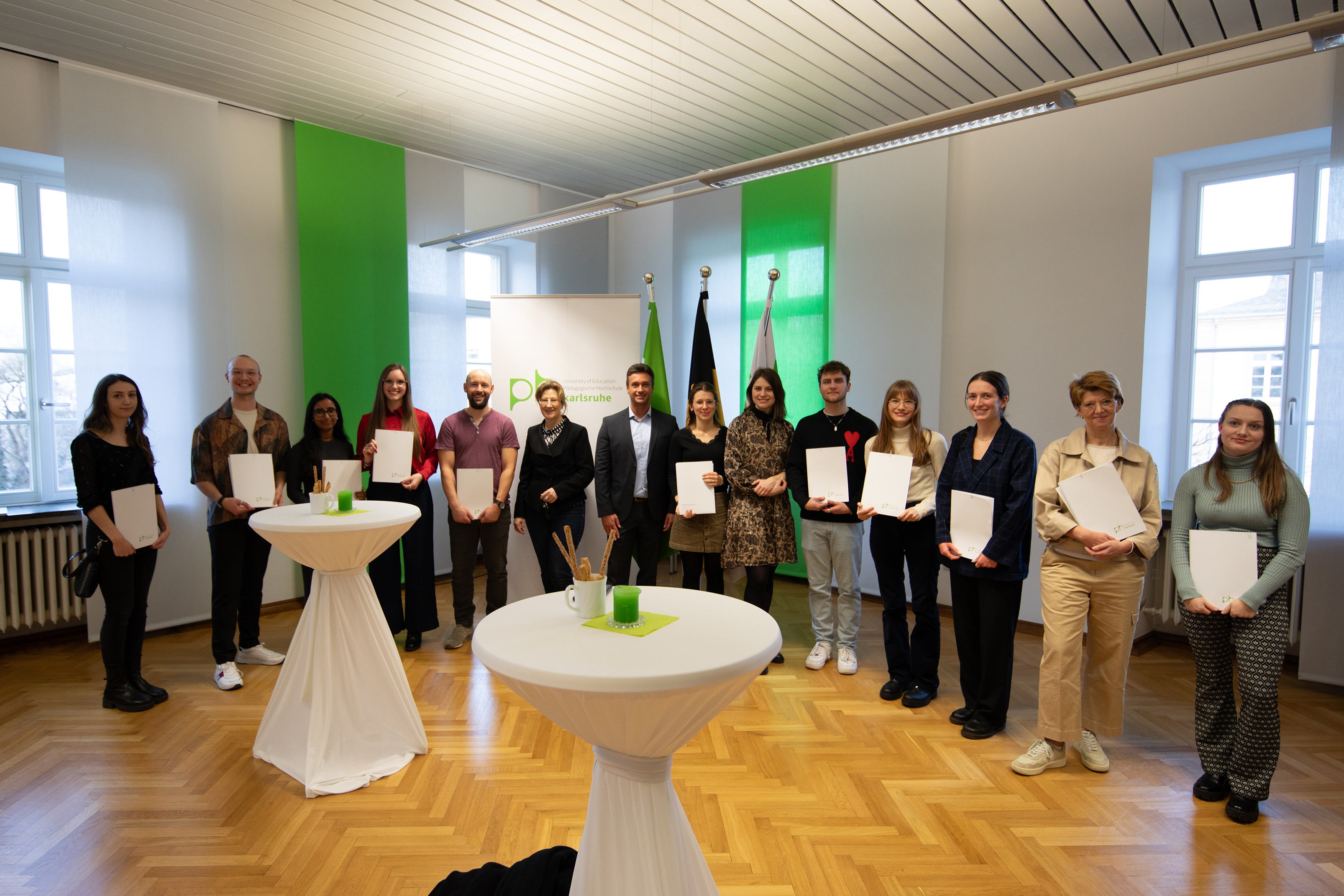 Insgesamt 15 Studierende der Pädagogischen Hochschule Karlsruhe (PHKA) werden im Förderzeitraum 2023/2024 mit dem Deutschlandstipendium unterstützt. Sie sind begabt und leistungsstark und zeichnen sich durch gesellschaftliches Engagement und besondere persönliche Leistungen aus. Das Stipendium umfasst 300 Euro pro Monat – die eine Hälfte kommt von Unternehmen oder Stiftungen, die andere Hälfte vom Bund. Um ihre Urkunden entgegenzunehmen und ihre Stifter kennenzulernen, kamen die PHKA-Stipendiatinnen und Stipendiaten des aktuellen Förderzeitraums kürzlich an der Hochschule zusammen.