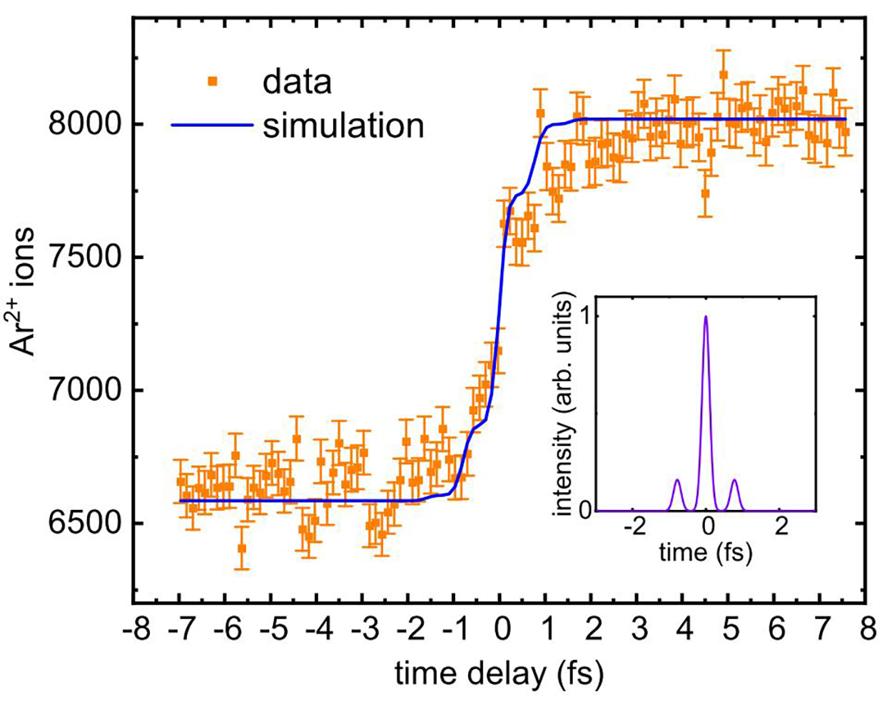 Graphik 2: Zwei-Farben APAPS. Die Erzeugung von Ar⁺, die von einem breitbandigen Attosekunden-Pump-Puls mit einer Photonenergie um die 20 eV initiiert wird, wird von einem zweiten Puls mit einer Photonenenergie um die 33,5 eV geprobt. Diese liegt über dem zweiten Ionisationspotenzial von Argon, sodass Ar²⁺, entsteht. Die größere Anzahl von Ar²⁺ Ionen bei positiven Zeitverzögerungen wir dadurch erklärt, dass deren Erzeugung effizienter ist, wenn der Probe-Puls auf den Pump-Puls folgt. Der Einsatz zeigt die Attosekunden-Puls-Struktur, die durch einen Fit erhalten wurde.