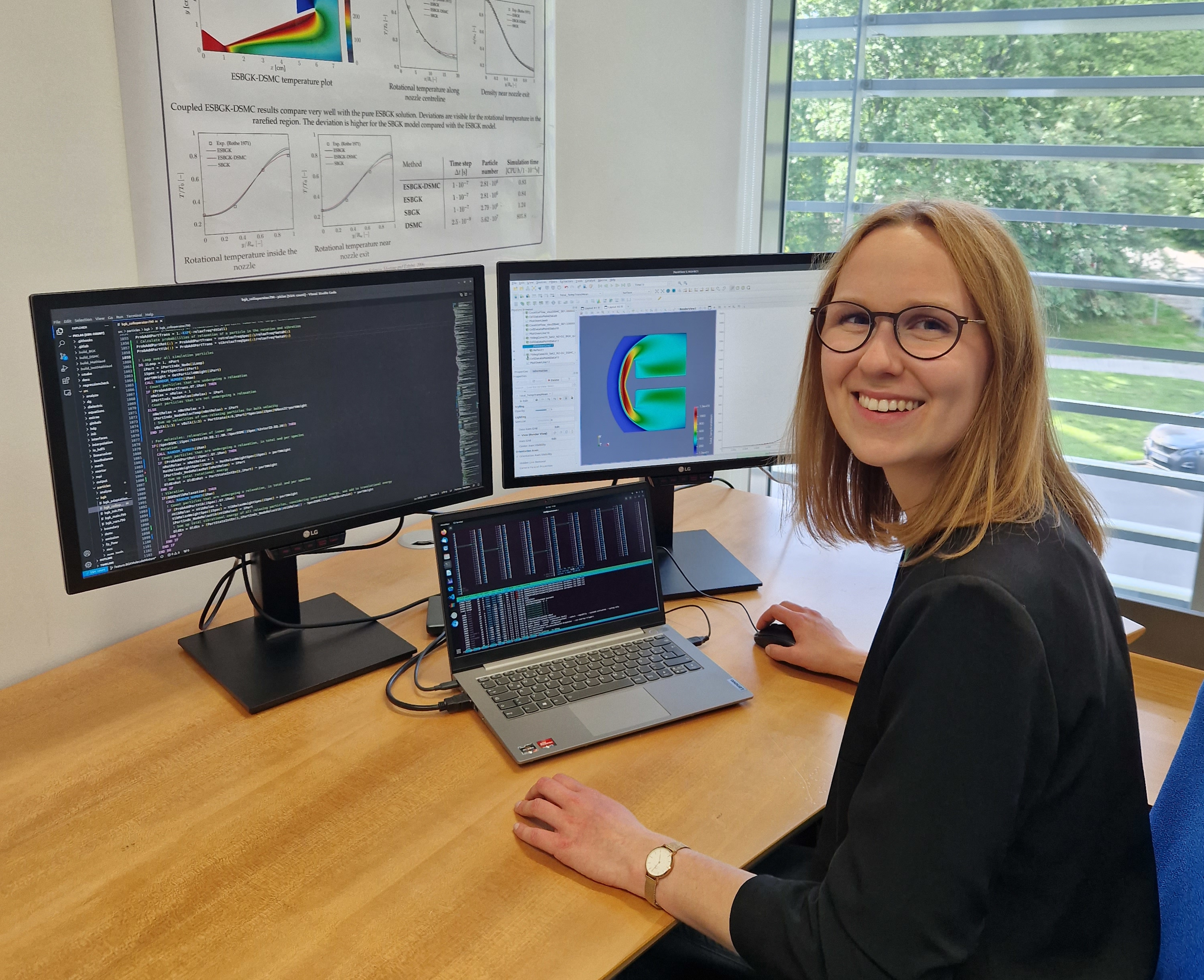 In großen Höhen in der Atmosphäre gilt es mit verdünnten Gasgemischen zu rechnen, je weiter es Richtung Erde geht, umso dichter werden diese. Für die Simulation verdünnter Gasgemische hat sich die sogenannte DSMC-Methode (Direct Simulation Monte Carlo-Methode) etabliert. Bei dichteren Gasgemischen kommt zur Strömungsberechnung die numerische Strömungsmechanik CFD (Computational Fluid Dynamics) zum Einsatz. „Die neue Methode, die ich implementiere, heißt BGK (Bhatnagar-Gross-Krook-Methode)“, erklärt Hild, und verweist auf deren Vorzüge: Sie lässt sich auch für die Übergangszone von verdünnten zu dichteren Gasgemischen nutzen und benötigt dabei weniger Rechenzeit für die Simulation dichterer Gase als die DSMC-Methode Diese Übergangszone ist beispielsweise besonders interessant beim Wiedereintritt von Raumkapseln, kommt es dabei doch zu einer Verdichtung der Gasschicht vor dem Körper, während sich hinter dem Körper kaum noch Gasteilchen befinden. In der Simulation wird die Bewegung einzelner Gaspartikel verfolgt sowie ihre Interaktionen mit dem Raumfahrzeug berechnet. Daraus können Rückschlüsse auf die Bedingungen im Gas und auf der Oberfläche des Raumfahrzeugs gezogen werden.
