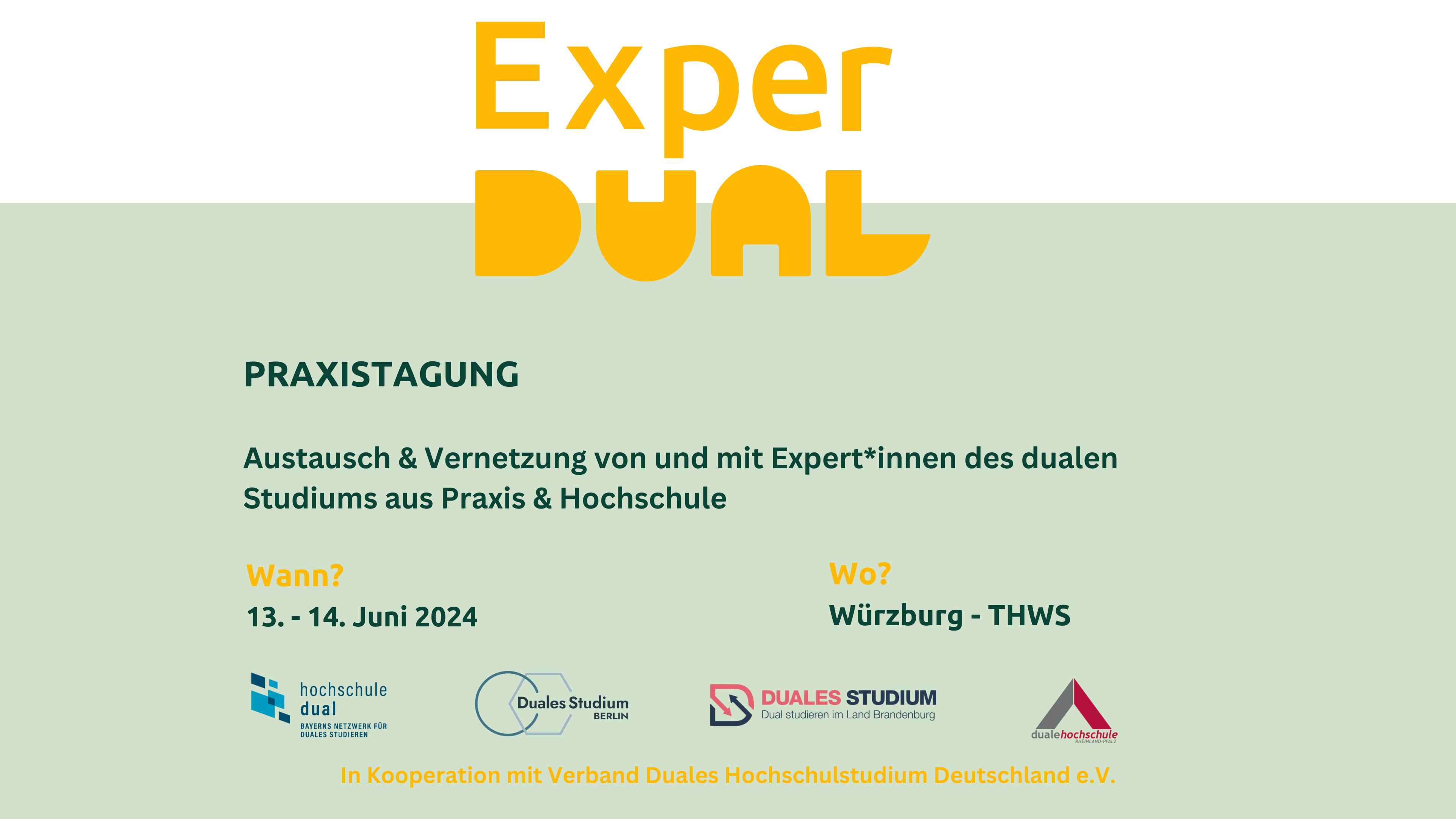 Vom 13.-14.6.2024 findet in Würzburg zum ersten Mal die ExperDual statt. Die Praxistagung will alle am dualen Studium Beteiligten zusammenbringen und somit zur qualitativen Weiterentwicklung des dualen Studiums an allen Lernorten beitragen.