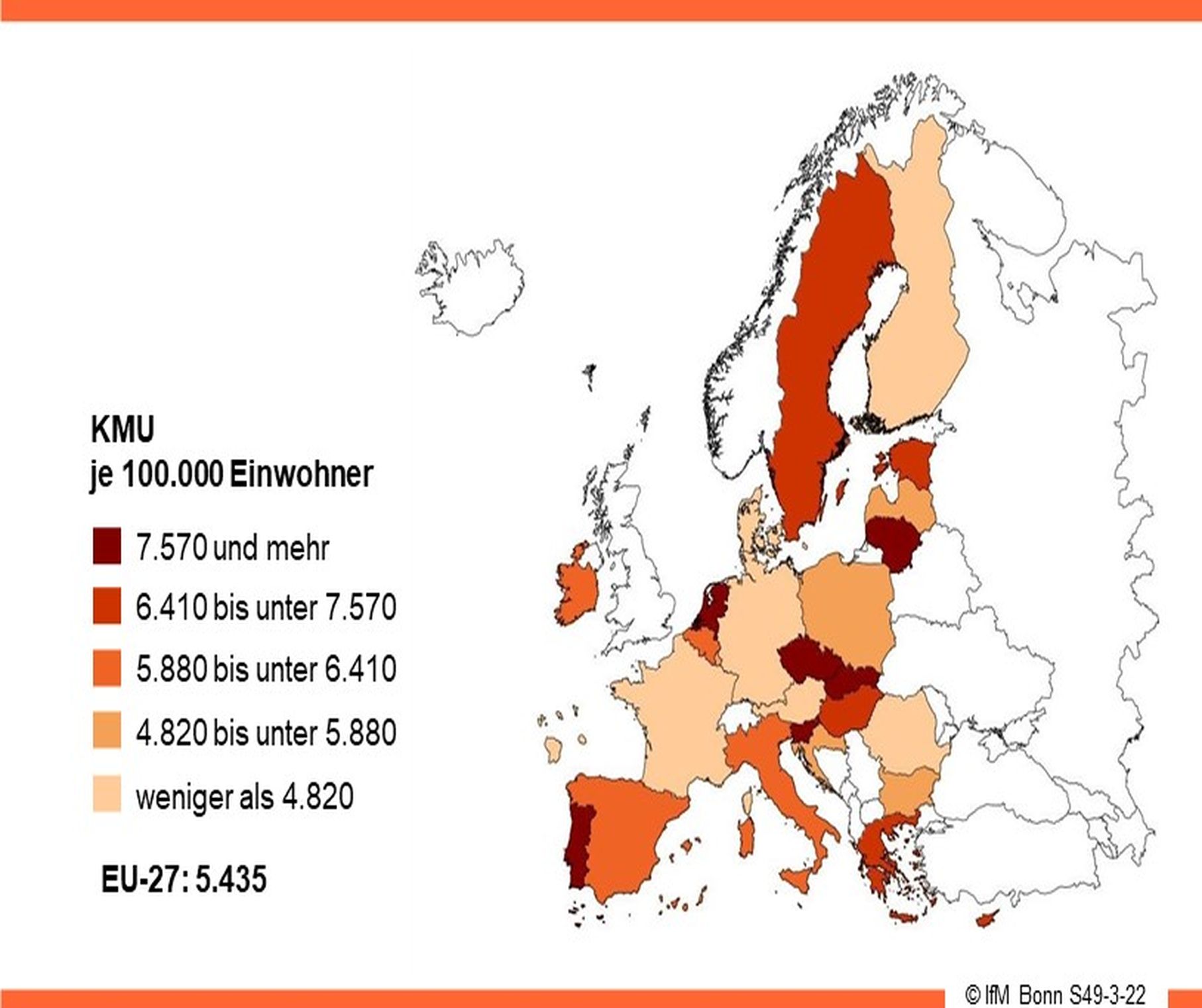 In den kleinen und mittleren Unternehmen (KMU) in Deutschland arbeiten mit durch-schnittlich 6,8 Mitarbeiterinnen und Mitarbeitern deutlich mehr Beschäftigte als im EU-Durchschnitt (3,5 Beschäftigte). Dafür ist die durchschnittliche KMU-Dichte hierzulande niedriger als in den anderen EU-Mitgliedsstaaten.Während in der Bundesrepublik schätzungsweise 2.987 KMU je 100.000 Einwohner zu finden sind, liegt der EU-Durchschnitt bei 5.435 KMU. Besonders hoch ist die KMU-Dichte in Tschechien (10.297 KMU), der Slowakei (9.616 KMU) und in Portugal (9.438 KMU).
