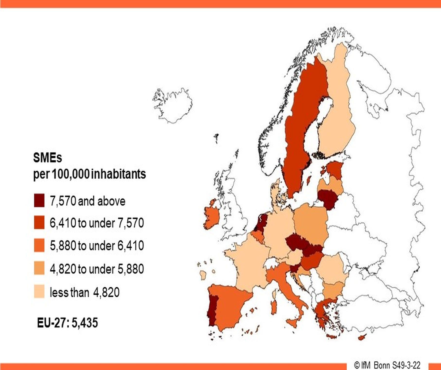 In small and medium-sized enterprises (SMEs) in Germany, an average of 6.8 employees work, significantly more than the EU average of 3.5 employees. In contrast, the average SME density in this country is lower than in other EU member states: While an estimated 2,987 SMEs per 100,000 inhabitants can be found in the Federal Republic, the EU average is 5,435 SMEs. Particularly high SME densities are observed in Czechia (10,297 SMEs), Slovakia (9,616 SMEs), and Portugal (9,438 SMEs).