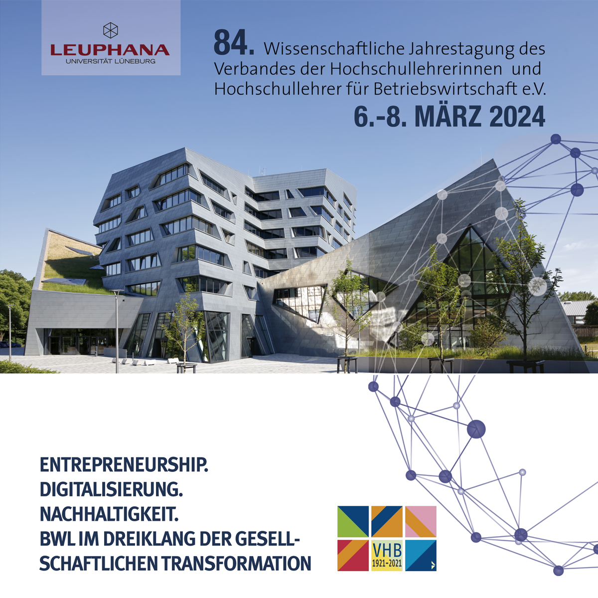 Das Streben nach „Impact“ ist und bleibt ein fester Teil der Betriebswirtschaftslehre (BWL). Die 84. Jahrestagung des Verbands der Hochschullehrerinnen und Hochschullehrer für Betriebswirtschaft findet vom 6. bis 8.3.2024 an der Leuphana Universität Lüneburg statt. Sie fokussiert auf Kernthemen, in denen das Fach seine interdisziplinären Stärken ausspielt: ENTREPRENEURSHIP. DIGITALISIERUNG. NACHHALTIGKEIT. BWL im Dreiklang der gesellschaftlichen Transformation. Mit rund 530 Referent:innen und Gästen, 130 Veranstaltungen und 250 Beiträgen verspricht der Kongress ein Ort des fruchtbaren Austauschs zu drängenden Fragen der ökonomischen, sozialen und ökologischen Transformation zu werden.