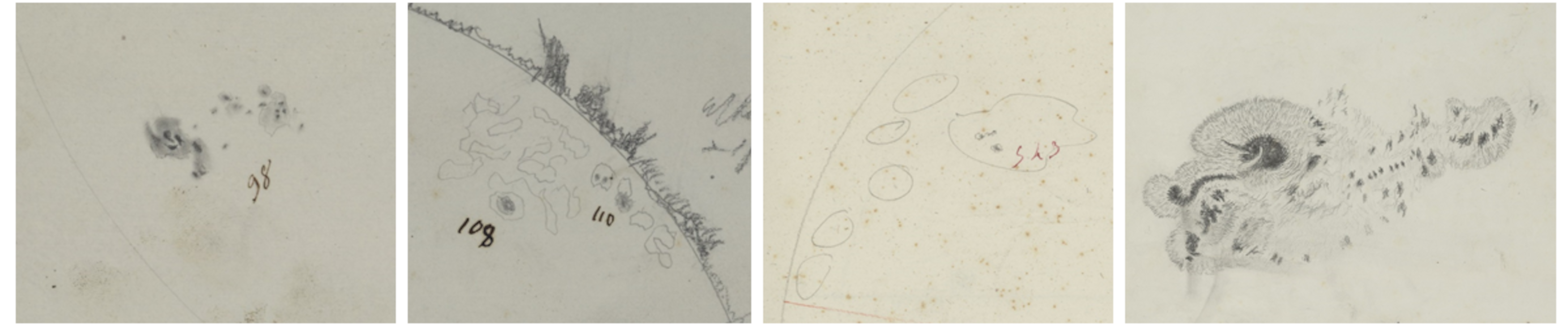 „Die Aufzeichnungen von Secchi und seinen Mitarbeitern sind die detailliertesten Daten über Sonnenflecken und andere ruhige und magnetische Regionen, die in diesem Zeitraum von der Sonnenoberfläche entstanden sind", sagt Dr. Illaria Ermolli vom INAF. „Zusätzlich zu den Informationen über die Position und die Fläche der Sonnenflecken enthalten viele Zeichnungen auch Daten über Sonnenfackeln, Spikulen und Protuberanzen sowie darüber, wie sich diese Regionen entwickelt haben. Zudem weisen Anmerkungen auf historische und natürliche Ereignisse hin, wie beispielsweise Feindseligkeiten in der Stadt und die Beobachtung spektakulärer Polarlichter", ergänzt Ermolli. Als Sonnenfackeln bezeichnen Wissenschaftler*innen besonders helle Gebiete auf der Sonnenoberfläche, die oftmals mit Sonnenflecken einhergehen; Spikulen und Protuberanzen sind Strukturen, die sich am Sonnenrand zeigen.