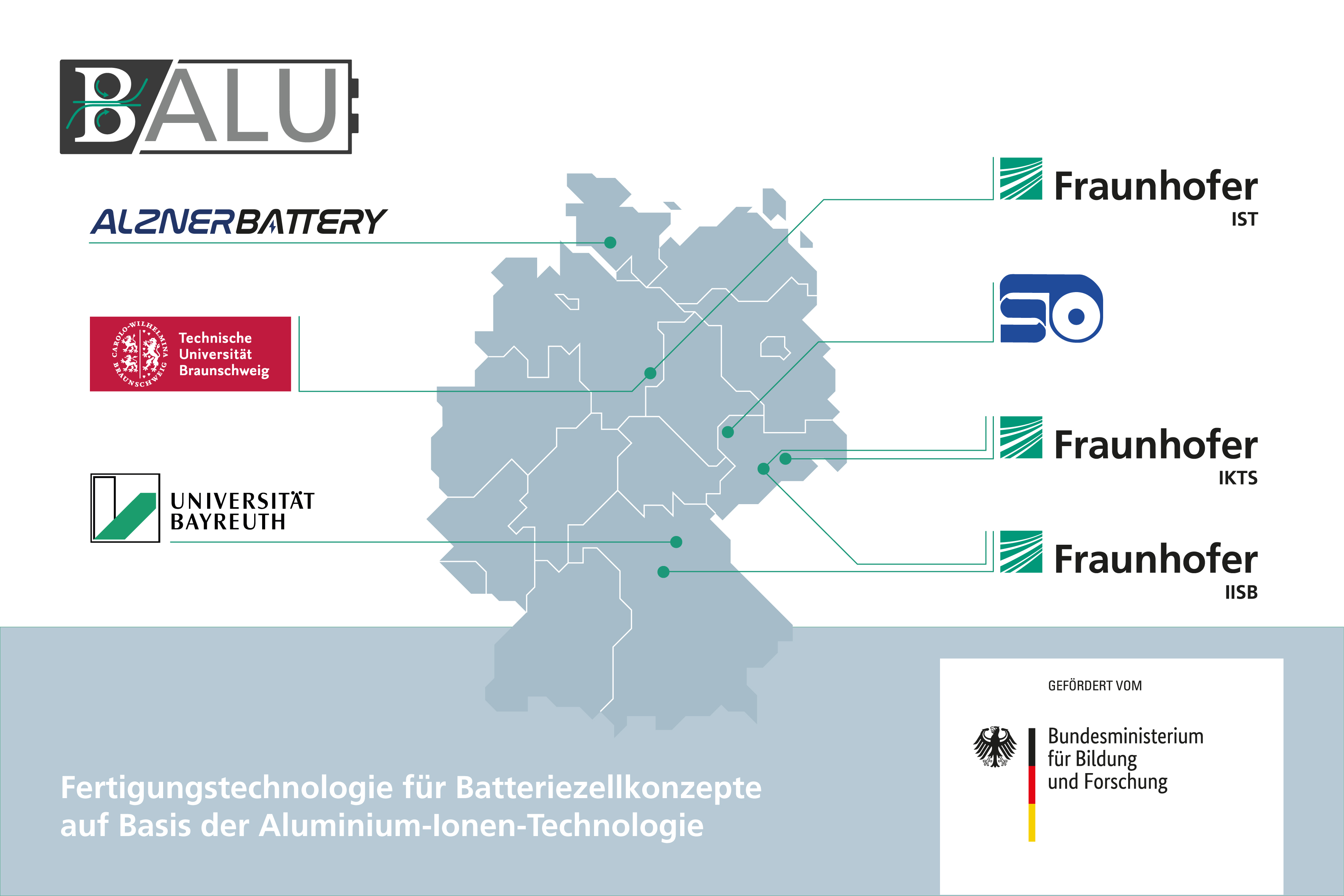 Das Fraunhofer-Institut für Integrierte Systeme und Bauelementetechnologie IISB in Erlangen ist spezialisiert auf Wide-Bandgap-Halbleiter und effiziente Leistungselektronik. An seiner Außenstelle in Freiberg, dem Fraunhofer-Technologiezentrum Hochleistungsmaterialien THM, arbeitet das Fraunhofer IISB gemeinsam mit dem Fraunhofer IKTS an nachhaltigen Batteriesystemen mit verbesserter Ökobilanz und Rohstoffverfügbarkeit. Im Projekt BALU ist das Fraunhofer IISB der Projektkoordinator und evaluiert die aktiven und passiven Komponenten für die AGDIB-Zellen einschließlich der Zellgehäuse. Dazu kommen die Entwicklung und Charakterisierung kostengünstiger, langzeitstabiler AGDIB-Zellkonzepte und von Funktionsdemonstratoren für AGDIB-Pouchzellen.
