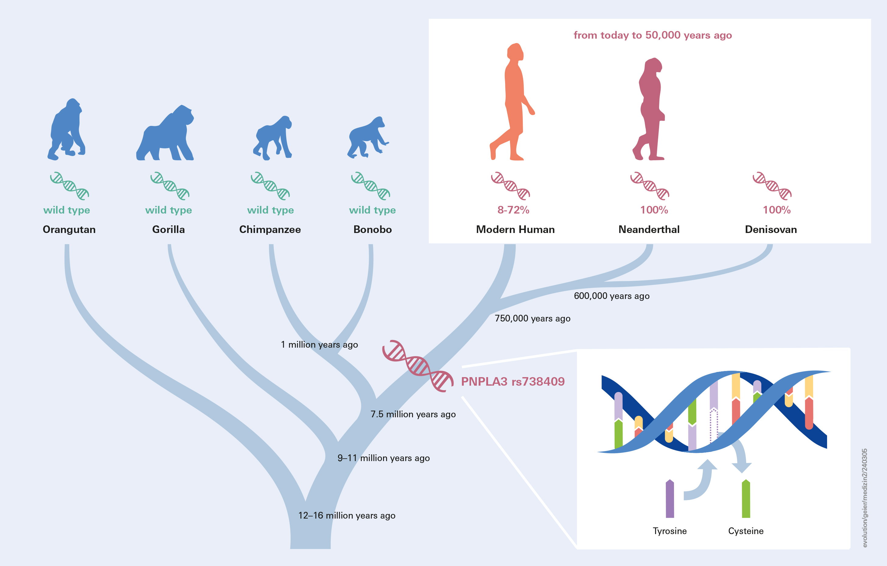 To explore the ancient origins of the PNPLA3 variant rs738409, the researchers first explored the deeper evolutionary context in other species from the human lineage tree. Analyzing the reference genome sequence of primates it became clear that all great apes (Chimpanzee, Bonobo, Gorilla, Orangutan) are actually carrying the ancestral, less risky, gene variant. Suprisingly, however, all available Neanderthal (total of 21) and Denisovan genomes (two, including the worldwide unique Neanderthal/Denisovan hybrid) dating back to 40,000-65,000 BP exclusively carried the risk allele suggesting fixation of the variant allele in their common ancestor. These findings led to the conclusion that the principal fatty liver gene variant PNPLA3 must have developed before the split of the human lineage some 700,000 years ago.