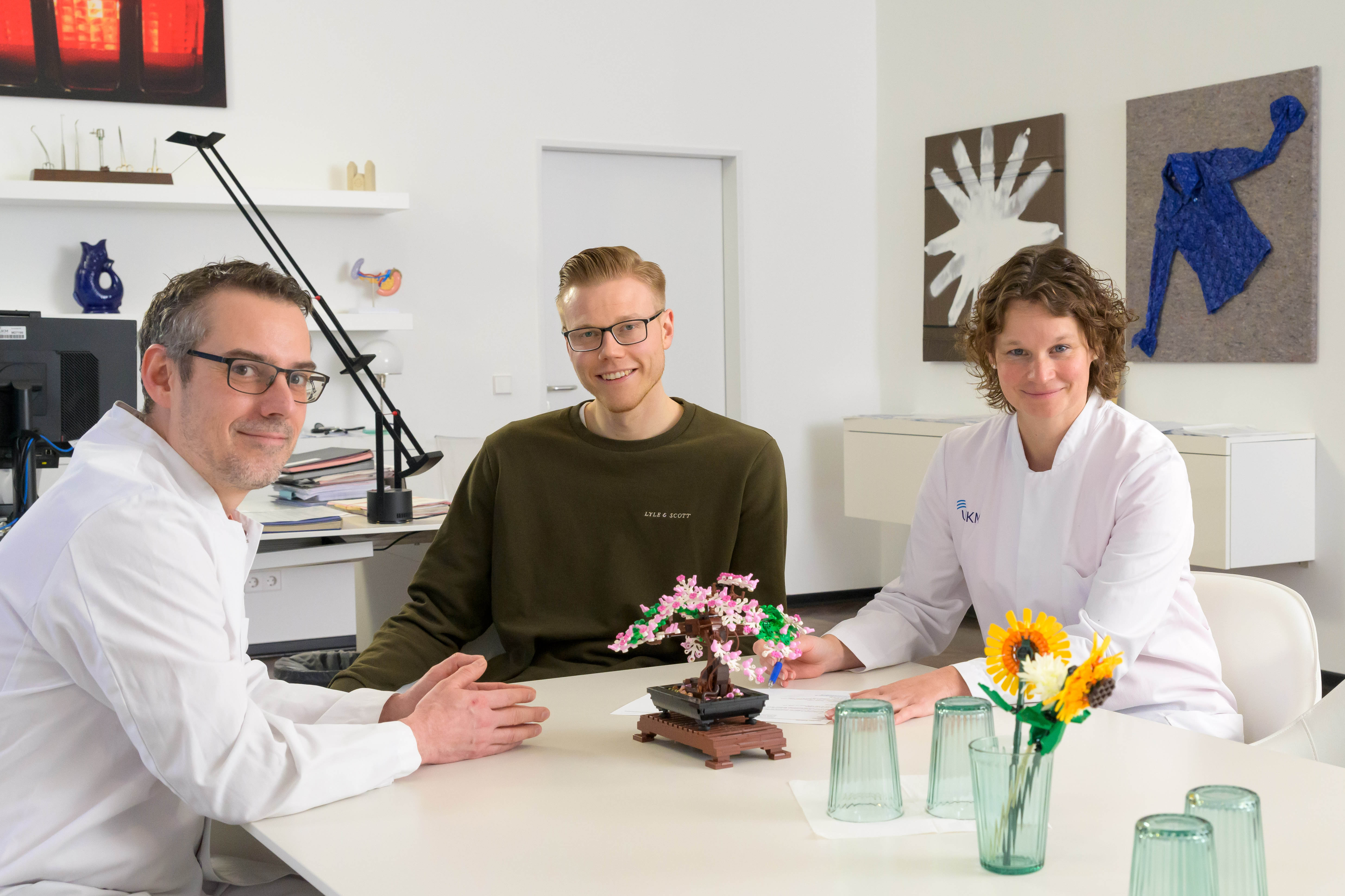 Weil der Krebs noch in einem frühen Stadium war, brauchte Bertels keine Chemotherapie vor der Operation zur Entfernung des Tumors. Während eines robotisch unterstützten Eingriffs entfernte Priv.-Doz. Dr. Philipp Houben, Leiter des UKM-Darmzentrums, gemeinsam mit seinem Team den gesamten Dick- und Mastdarm. „So konnten wir nicht nur den vorhandenen Krebs beseitigen, sondern darüber hinaus auch alle sich möglicherweise im Dickdarm befindlichen Krebsvorläufer und das damit verbundene Risiko“, so der Chirurg. Tumorgewebe- und Stuhlproben werden nun in der Zentralen Biobank der Medizinischen Fakultät Münster eingelagert und können auch im Rahmen der PerMiCCion-Studie mit den Proben anderer Betroffenen verglichen werden. „Es geht darum, Risikofaktoren zu identifizieren, um frühzeitig handeln zu können und so die Heilungschancen deutlich zu steigern“, sind sich Houben und Bleckmann einig.