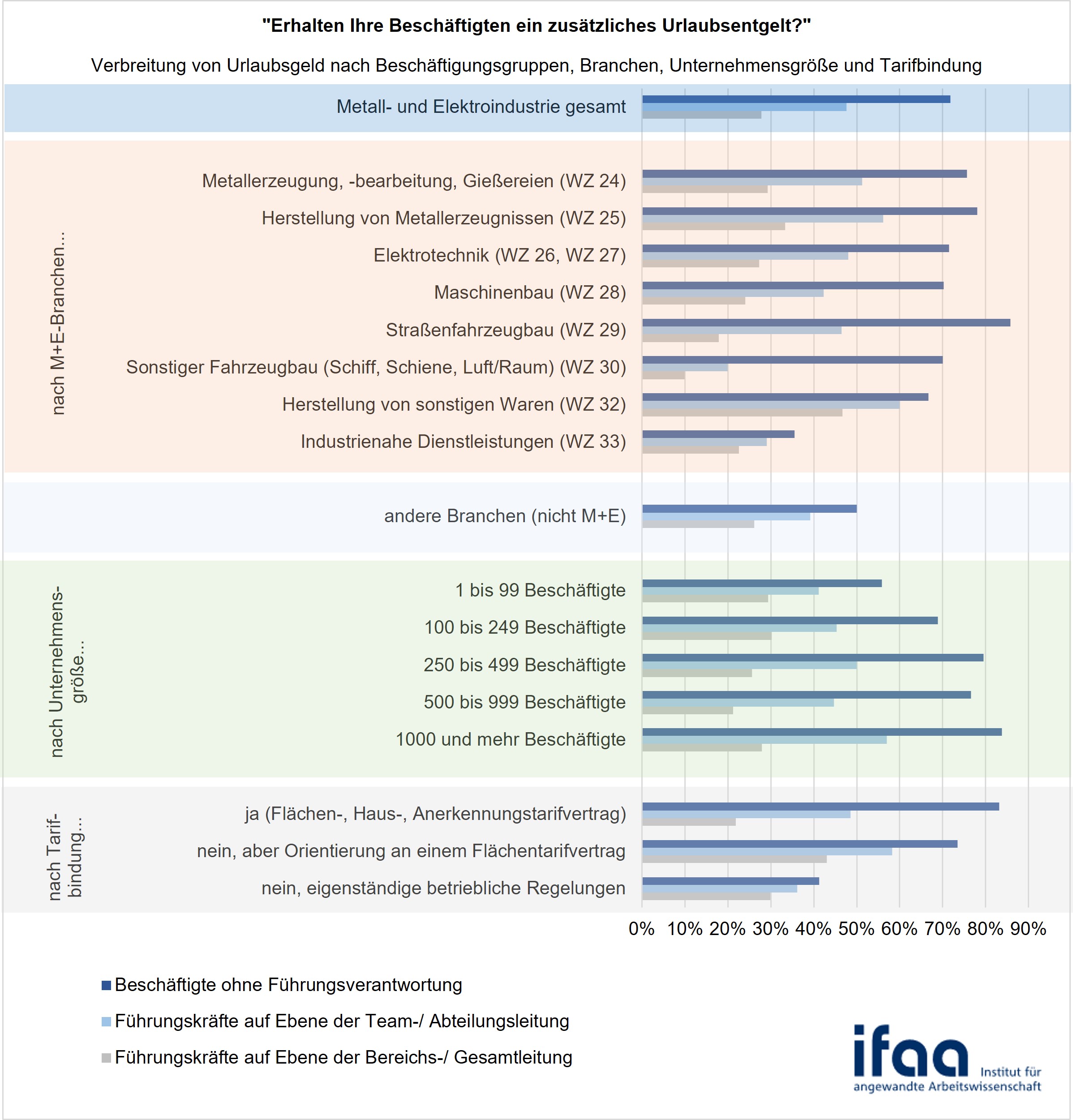 Zur Verbreitung von Urlaubsgeld sowie anderen monetären und nicht monetären Zusatzleistungen lesen Sie in der Broschüre „ifaa-Studie: Anreiz- und Vergütungssysteme in der Metall- und Elektroindustrie 2023“ (https://www.arbeitswissenschaft.net/verguetungsstudie-2023.