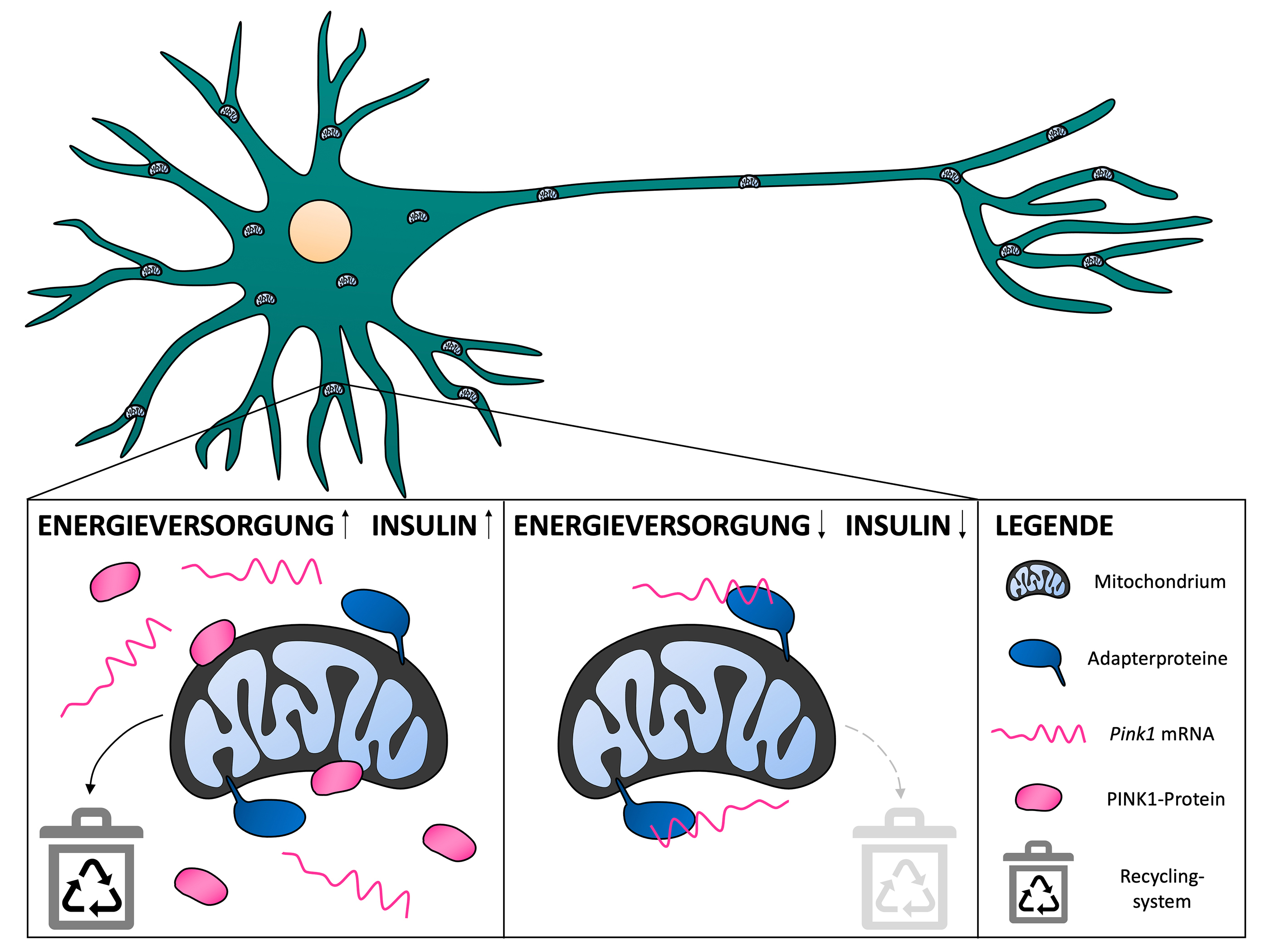 Im Falle des Mitochondrien-Recyclings funktioniert das folgendermaßen: Ist genügend Energie vorhanden, wird ein Signal vom Insulinrezeptor auf der Zelloberfläche zu den Mitochondrien weitergeleitet. Dort sind die PINK1-Baupläne als mRNA-Moleküle zwischengelagert. Beim Eintreffen des Insulinsignals werden sie freigegeben und die Zelle kann zusätzliches PINK1-Protein herstellen. Dieses sorgt dafür, dass defekte Mitochondrien effizient aussortiert werden. Herrscht hingegen Energieknappheit, oder fehlt das Signal des Insulinrezeptors, werden die Baupläne für PINK1 fest an die Mitochondrien gebunden. Das ermöglicht einerseits den Transport der Baupläne in die langen Zellfortsätze der Nervenzelle, verringert aber andererseits auch die Verfügbarkeit für die PINK1-Herstellung. Das Recycling von Mitochondrien wird verringert – auch wenn das zum Weiterbetrieb von beschädigten Kraftwerken führen kann.