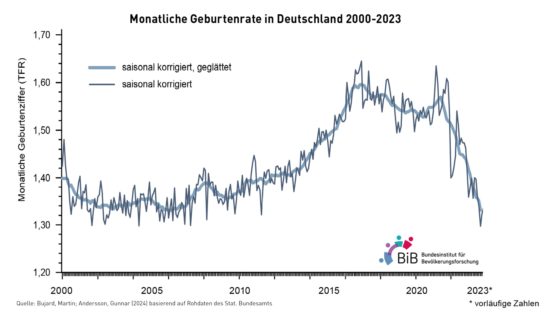 Innerhalb der vergangenen beiden Jahre ist die Geburtenrate in Deutschland deutlich zurückgegangen. Sie fiel von 1,57 Kindern pro Frau in 2021 auf rund 1,36 im Herbst 2023. Damit ist das Fertilitätsniveau so niedrig wie seit über zehn Jahren nicht mehr. Diese Zahlen basieren auf einer Veröffentlichung des Bundesinstituts für Bevölkerungsforschung (BiB) und der Universität Stockholm in der internationalen Fachzeitschrift „European Journal of Population“. Der Beitrag bezieht sich auf Berechnungen der monatlichen Geburtenzahlen und stellt die Entwicklungen in Deutschland und Schweden gegenüber.