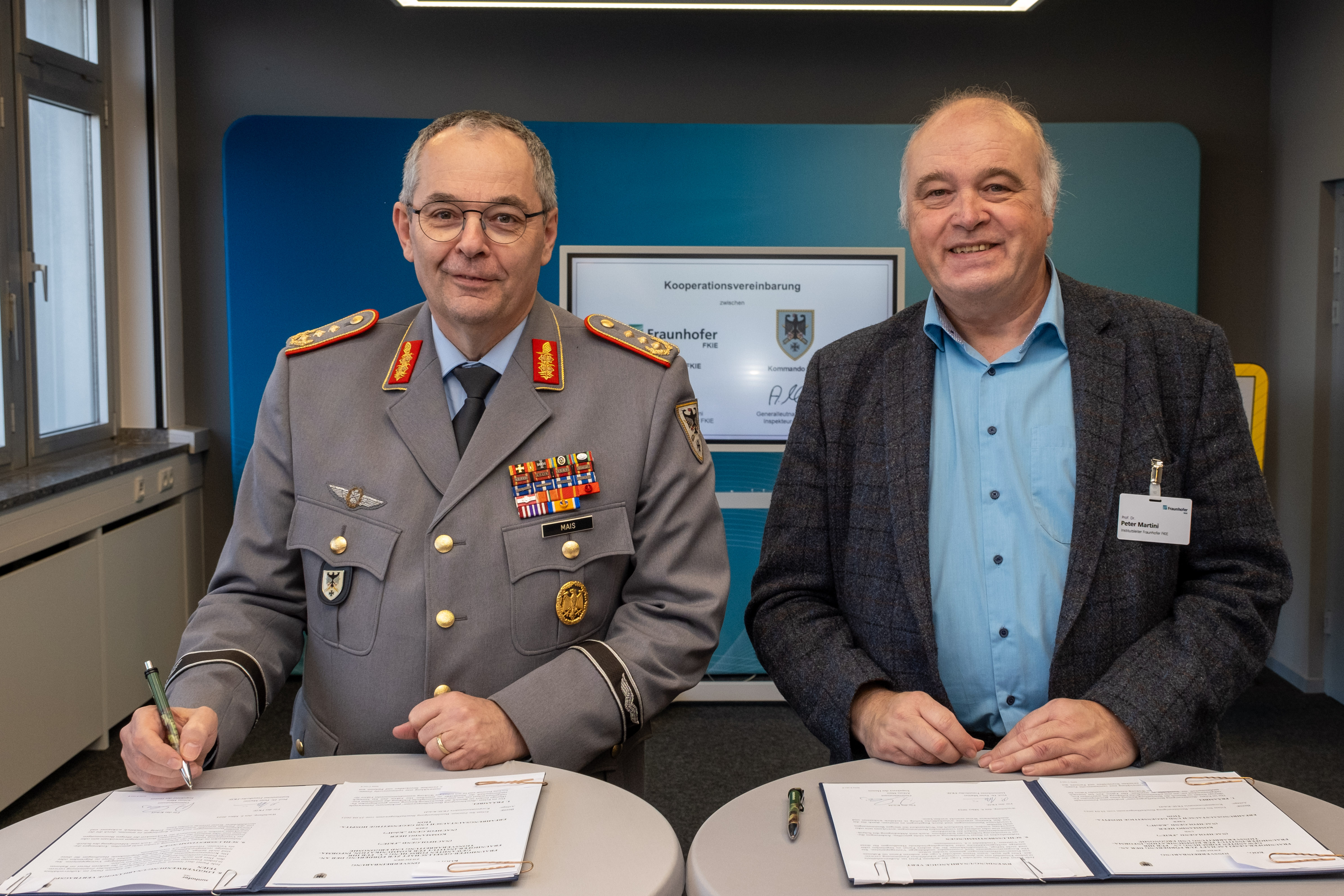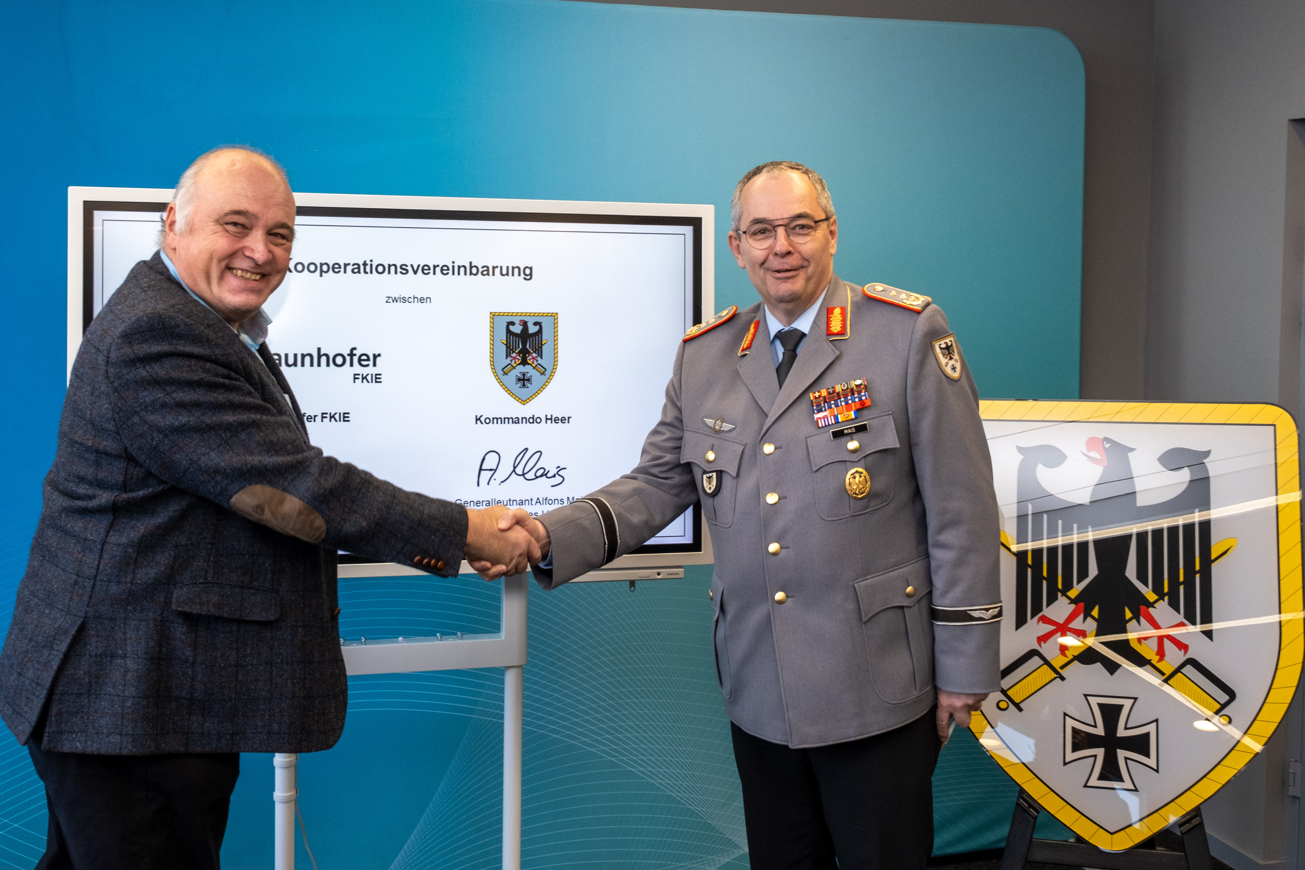 Das Kommando Heer (KdoH) und das Fraunhofer-Institut für Kommunikation, Informationsverarbeitung und Ergonomie FKIE intensivieren ihre Zusammenarbeit. Der Inspekteur des Heeres, Generalleutnant Alfons Mais, und Institutsleiter Prof. Dr. Peter Martini unterzeichneten am FKIE-Standort Wachtberg eine Kooperationsvereinbarung, mit der die Partner ein gemeinsames Ziel verfolgen: die kontinuierliche und vor allem schnelle Erschließung neuer Potenziale und Technologien für die Landstreitkräfte.