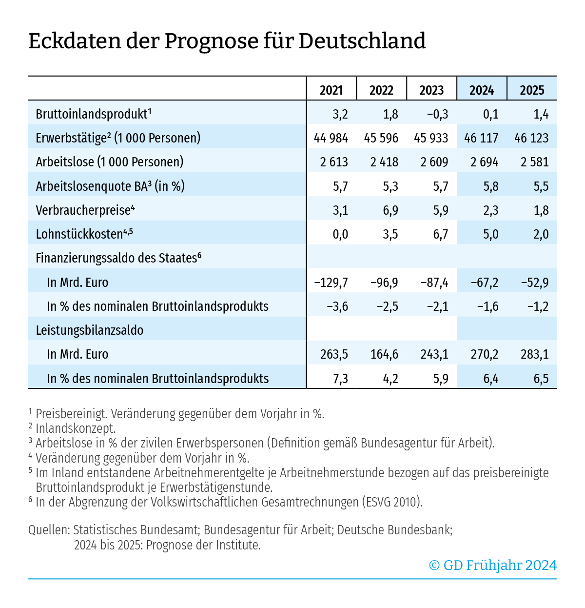 Die Fehlbeträge im gesamtstaatlichen Haushalt gehen in Relation zur Wirtschaftsleistung von 2,1 Prozent im Vorjahr auf 1,6 (2024) und 1,2 Prozent (2025) zurück. Die Einnahmenquote der öffentlichen Hand erreicht in den beiden Prognosejahren mit 47,5 und 48,4 Prozent jeweils gesamtdeutsche Rekordwerte.