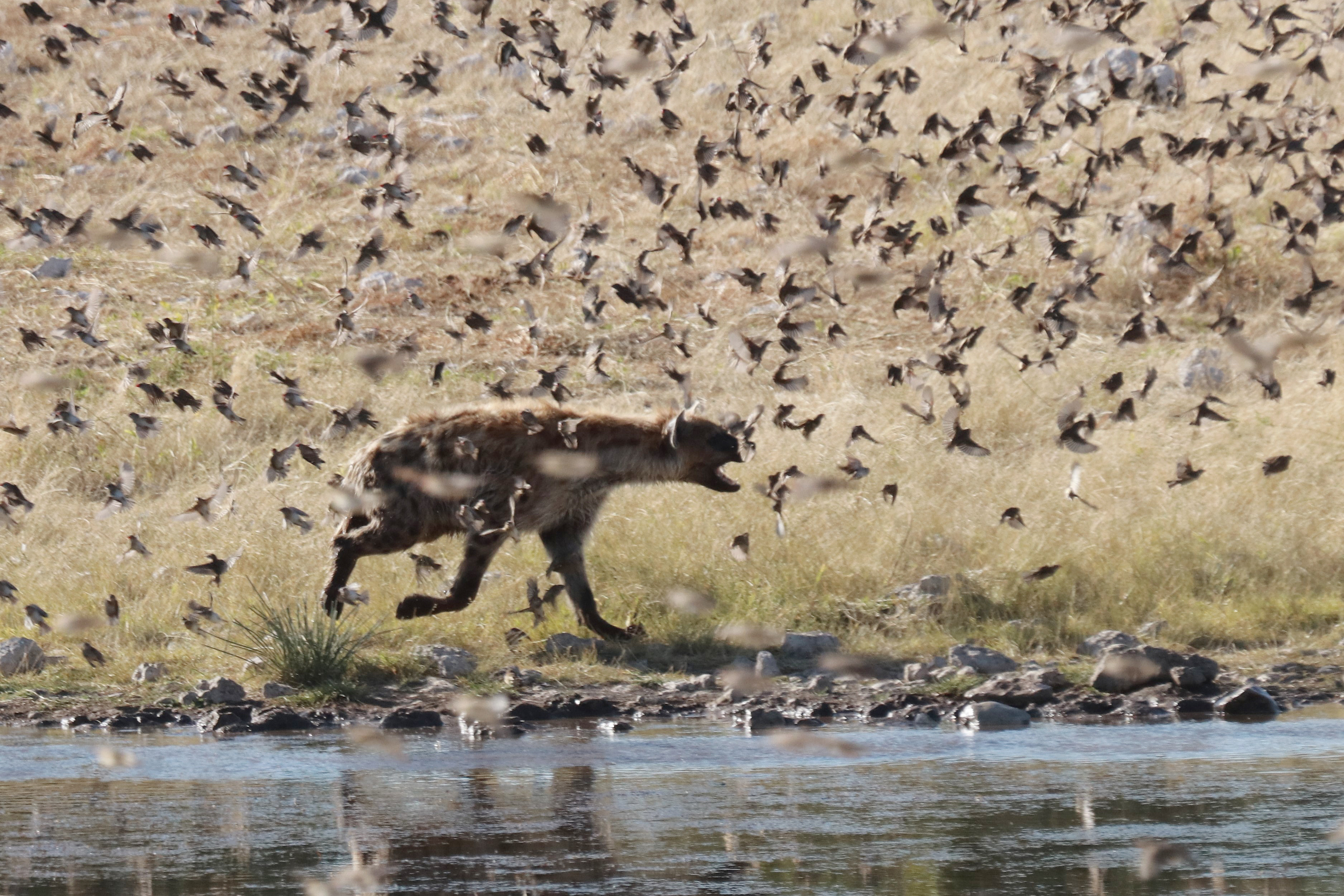 Hyänen gehören zu den Generalisten unter den Raubtieren mit einer breiten Palette an Beutetieren. Vorrangig jagen und erbeuten sie größere Säugetiere wie Antilopen, ernähren sich jedoch gelegentlich auch von kleinen Säugetieren oder Reptilien. Flexibel in der Beutewahl zu sein ist eine kluge Strategie für Generalisten – bei Tüpfelhyänen erstreckt sich das sogar auf kleine Vögel, wie Wissenschaftler des Leibniz-Instituts für Zoo- und Wildtierforschung (Leibniz-IZW) und der Universität Ljubljana in Namibia beobachteten: Tüpfelhyänen jagten fliegende Blutschnabelweber, eine Singvogelart aus der Familie der Webervögel.